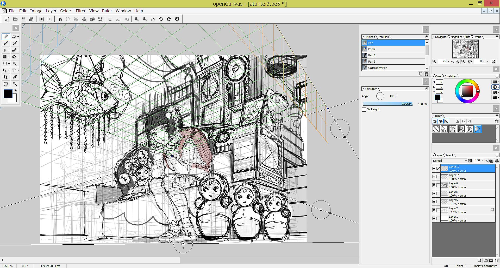 Perspective ruler helps you to create a three-dimensional illustration and to draw a precise building. There are one-point, two-point, and three-point perspective rulers. Parallel, radial, concentric circle rulers are not only convenient for creating effect lines but also useful for drawing background objects.
