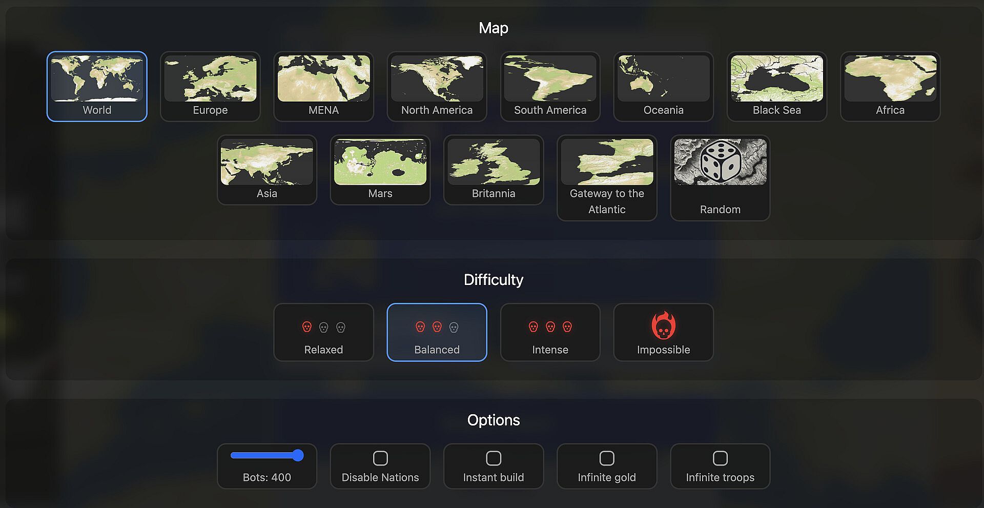 OpenFront is an exhilarating PvP battle-royale experience where players vie for global domination. Hundreds of competitors clash on a single, sprawling map, engaging in intense combat to expand their territories. Forge alliances through trade, amass wealth in gold, and unleash devastating nuclear strikes to obliterate your rivals. Strategy and supremacy reign in this unforgiving world—will you rise to conquer it all?