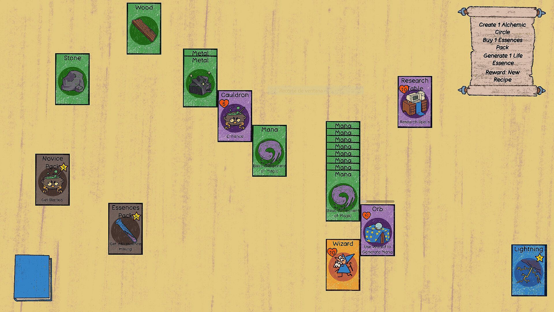 The game begins with a Wizard card and an Orb card. Make the Wizard ponder the Orb and start generating Mana, the most basic resource in the game. You will use it to purchase booster packs, to make new buildings and resources and to create spells.