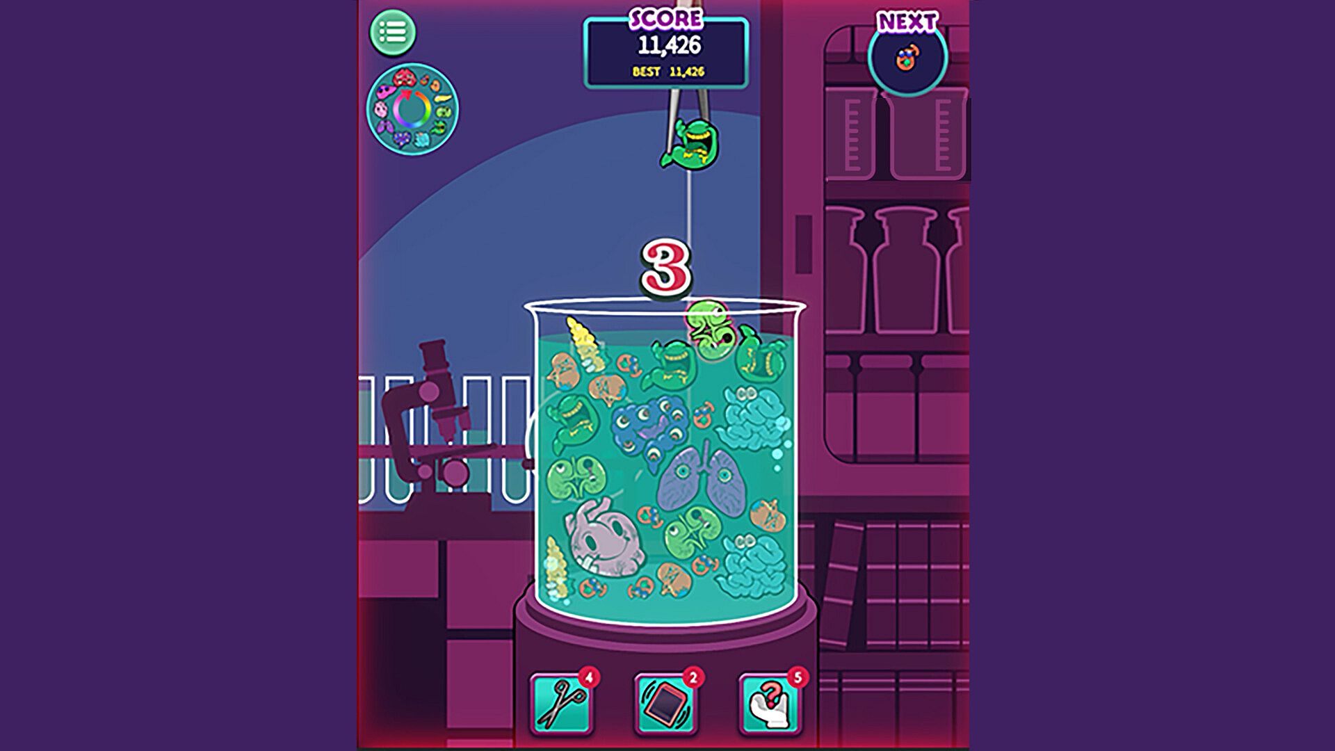 The goal of the game is to get a high score so that the organs do not overflow from the beaker.