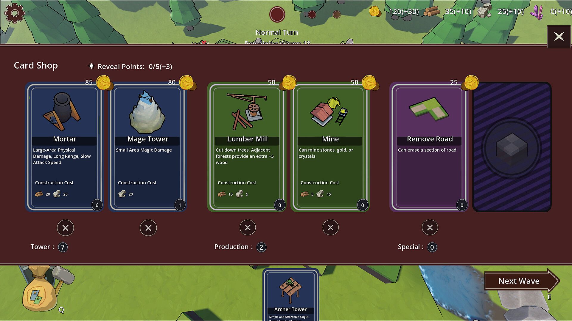 Resources are the core of strategy. Building and upgrading towers requires materials, and purchasing cards requires gold. Everything is interconnected — you must gather, deploy, and manage efficiently to establish a functioning system on the board.