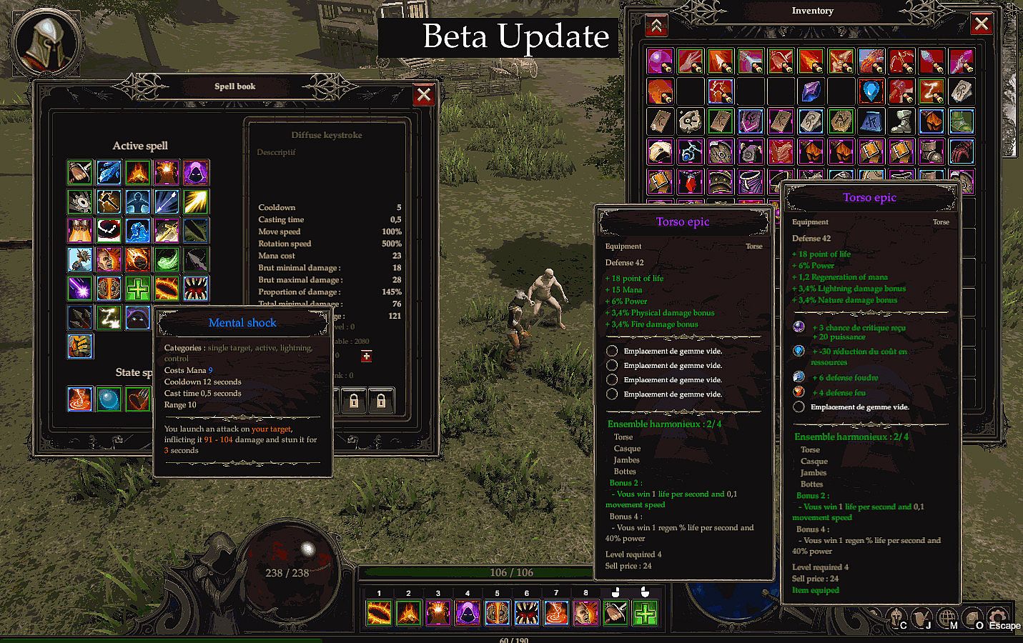 Procedural objects : Each object can have particular spells and in addition belong to a set, making the number of combinations more important than on other hack'n slash. Your best items can also be upgraded with the blacksmith, the enchantress, and gems.