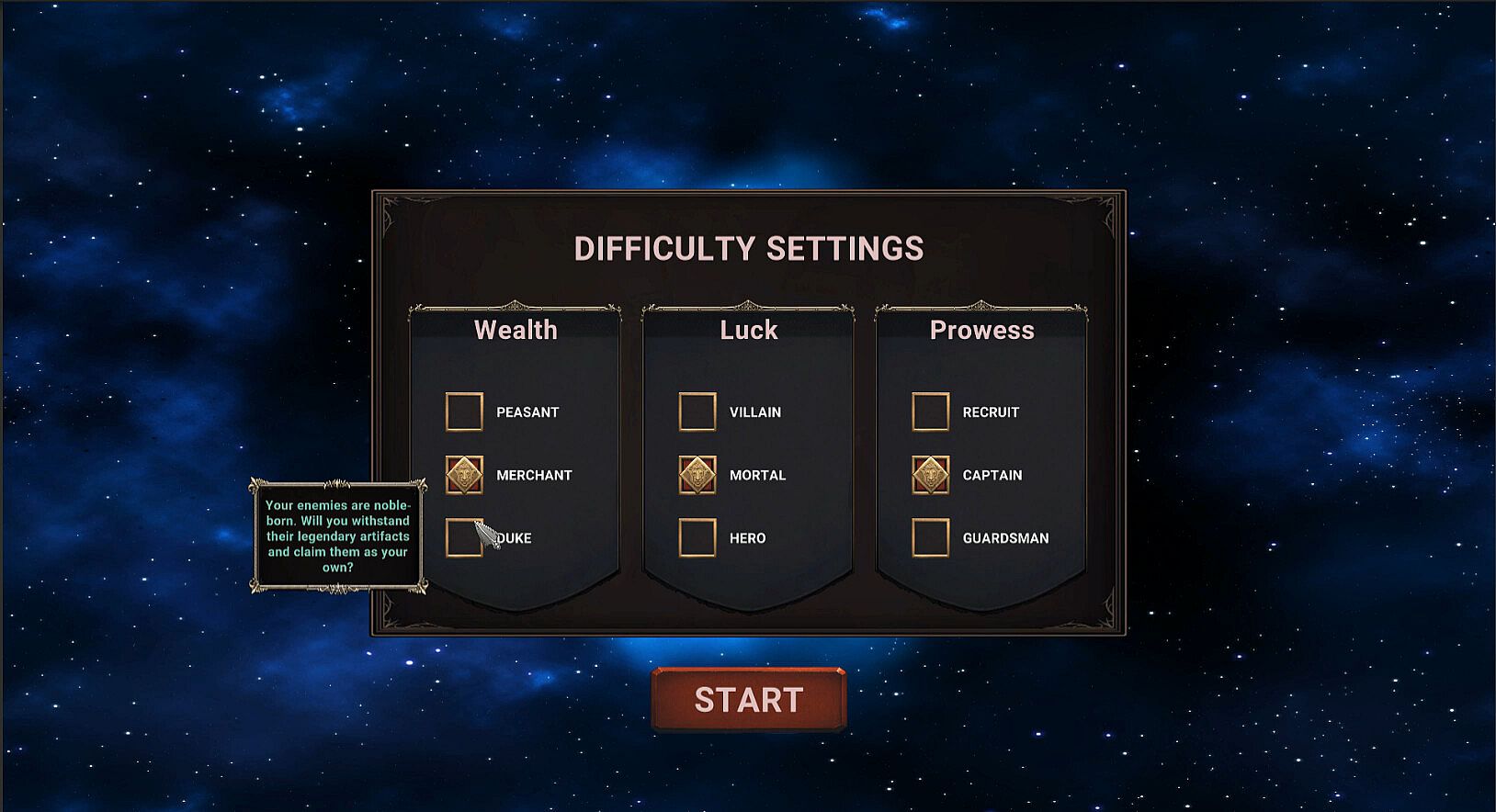 - A flexible difficulty system. Will your enemies be penniless beggars or princes clad in shining armor? Will they be favorites of fate or cursed to perish at the hands of the hero? The choice is yours alone. And remember, the higher the risk, the greater the reward.