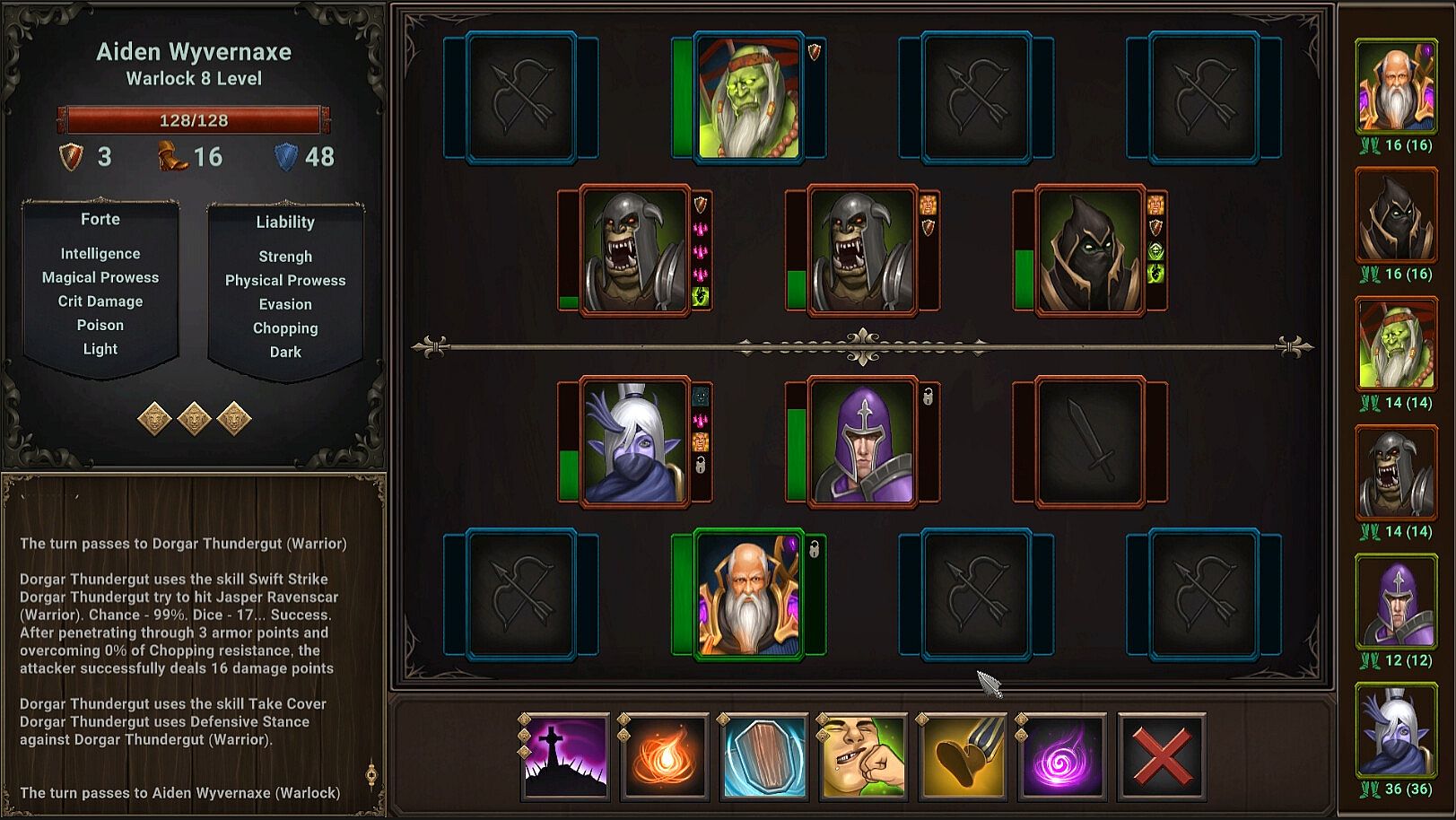 - Turn-based battles with dozens enemies, abilities, statuses, triggers and effects.