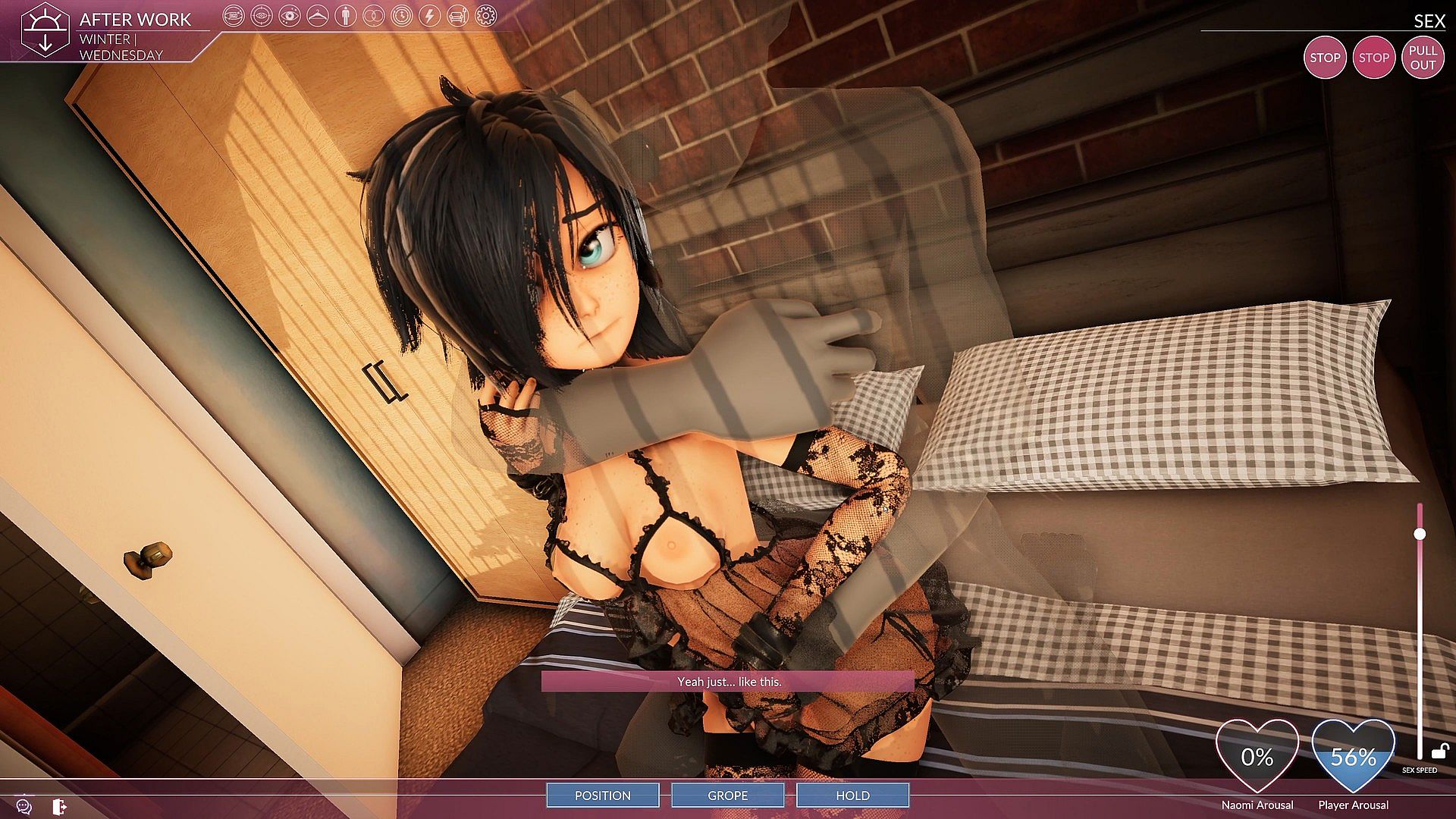 • Sex Sim gameplay with various speed and cumming options, groping, petting. Sounds and moans that vary based on the intensity and Naomi arousal.