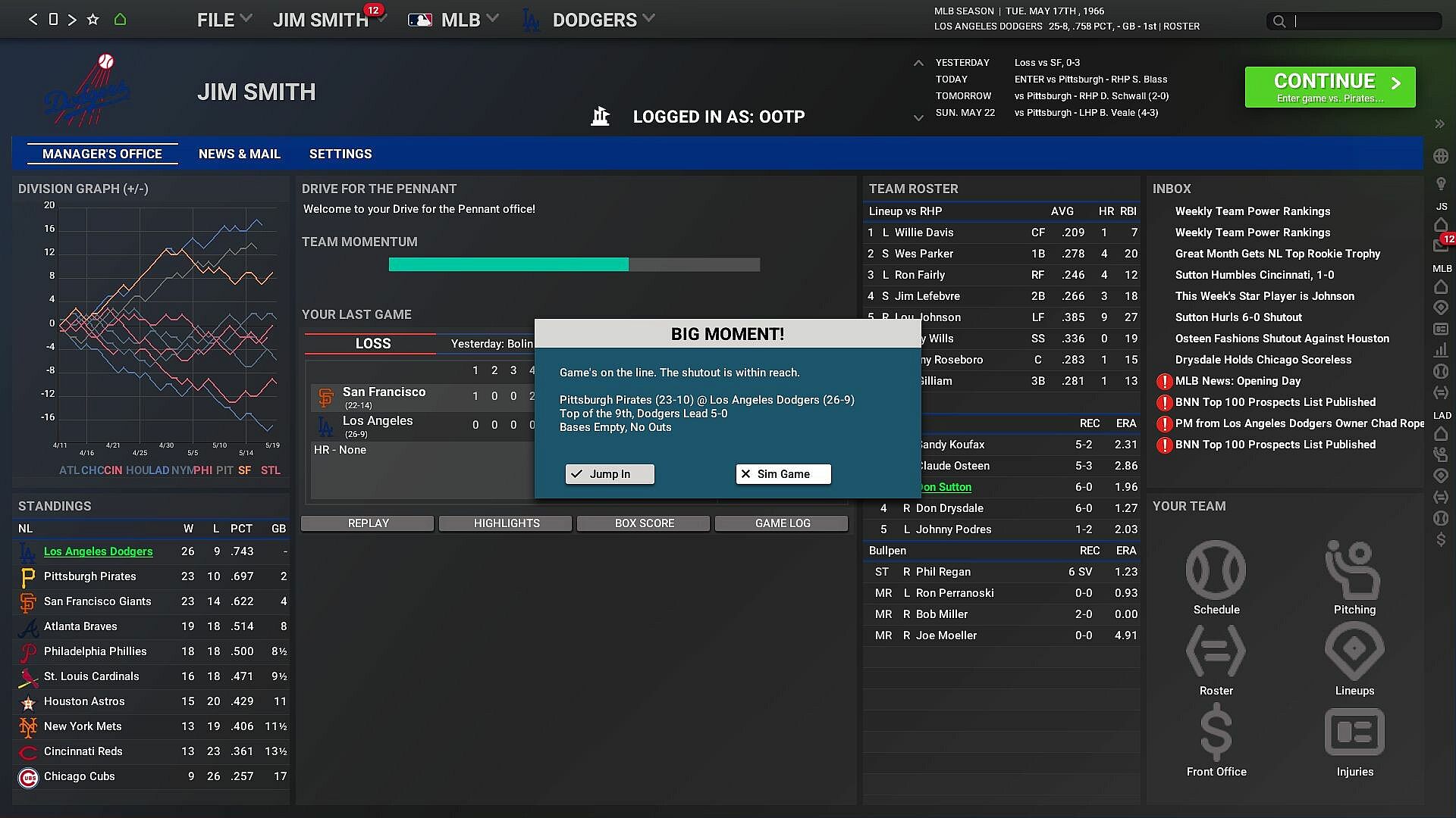Out of the Park Baseball 26 runs on PC/Mac/Linux and features the American League and National League logos, the World Series trophy, official logos and jerseys for all 30 MLB teams and 15 KBO teams, over 150 Minor League Baseball league and team logos, and historical MLB logos.