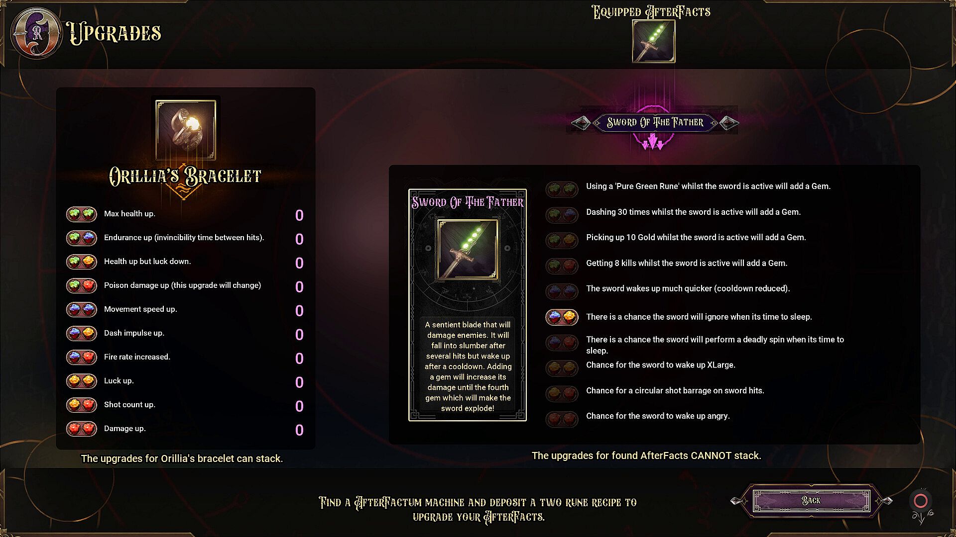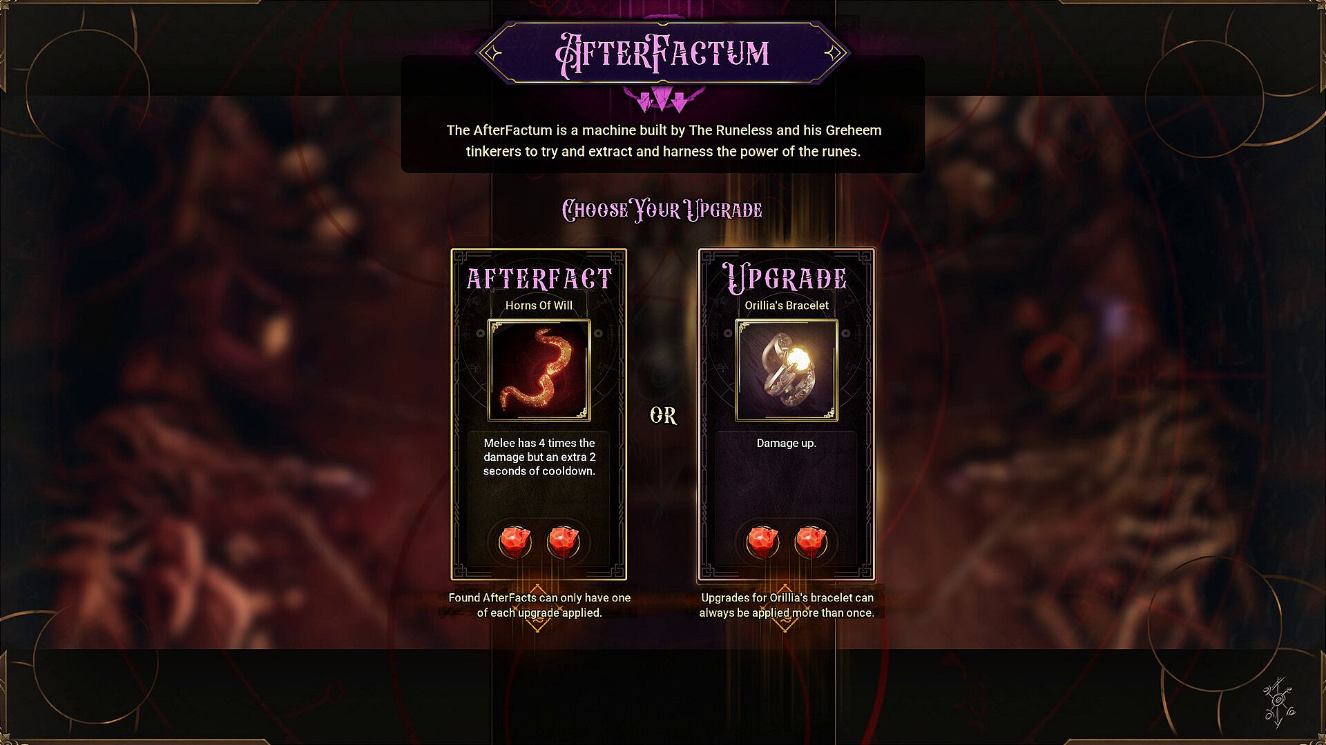AfterFacts are magical items that the Rune-less is trying to deconstruct and use for his evil deeds. When a person is born, the afterbirth contains a calcified magical rune that is infused into an item. These items can be anything, but they are often personal to that person. In Orillia's case, her AfterFact is a bracelet. You will find them on your escape attempts, and they bestow powerful effects onto Orillia that can be upgraded at the AfterFactum machines.