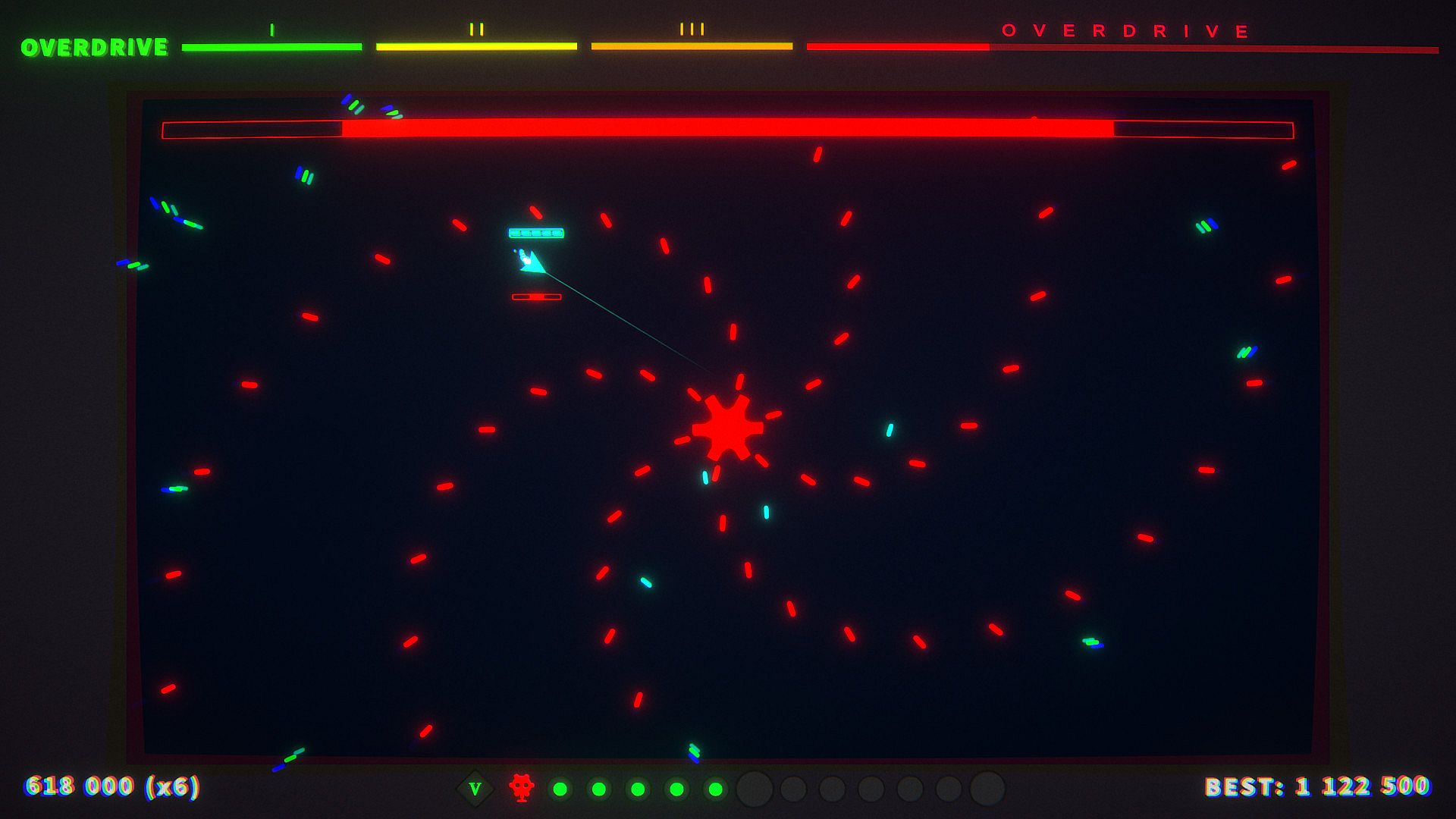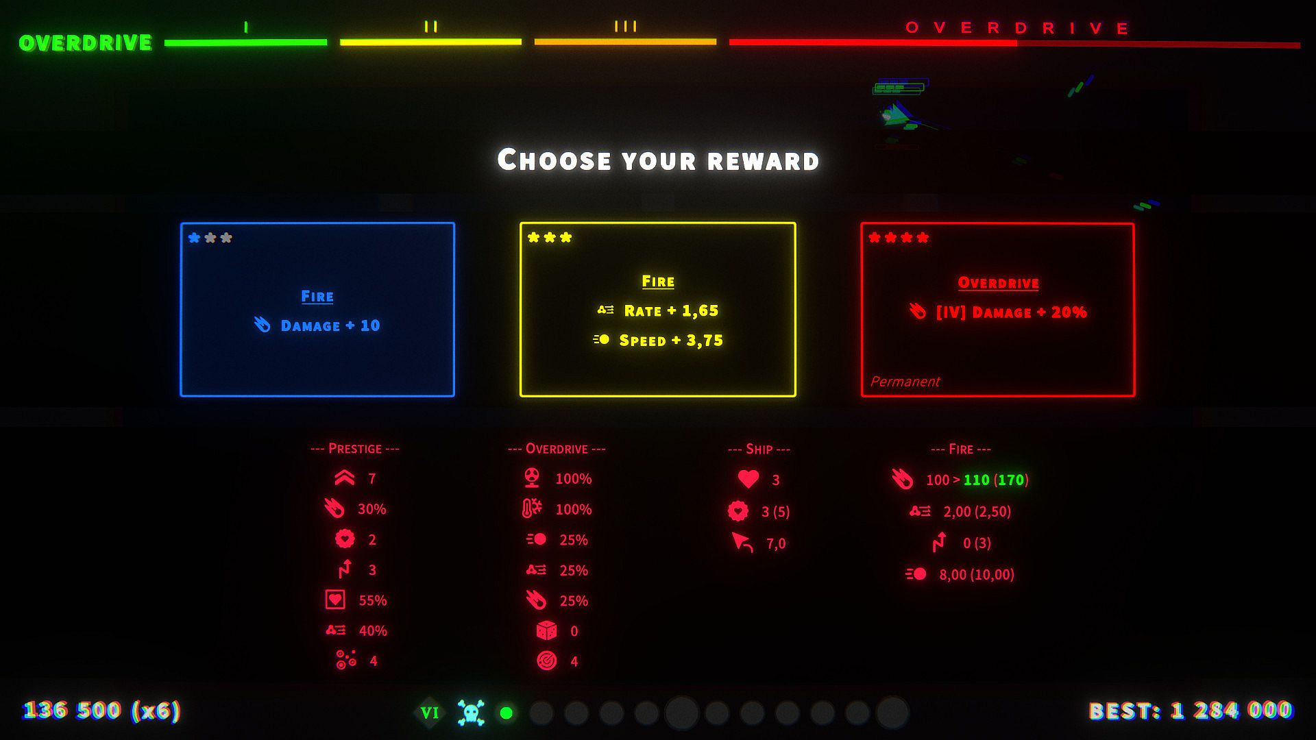 • Shoot'em up with a twist: shooting increase the OVERDRIVE gauge and grant you bonuses but watch out, if you max out the OVERDRIVE, you will take a damage!