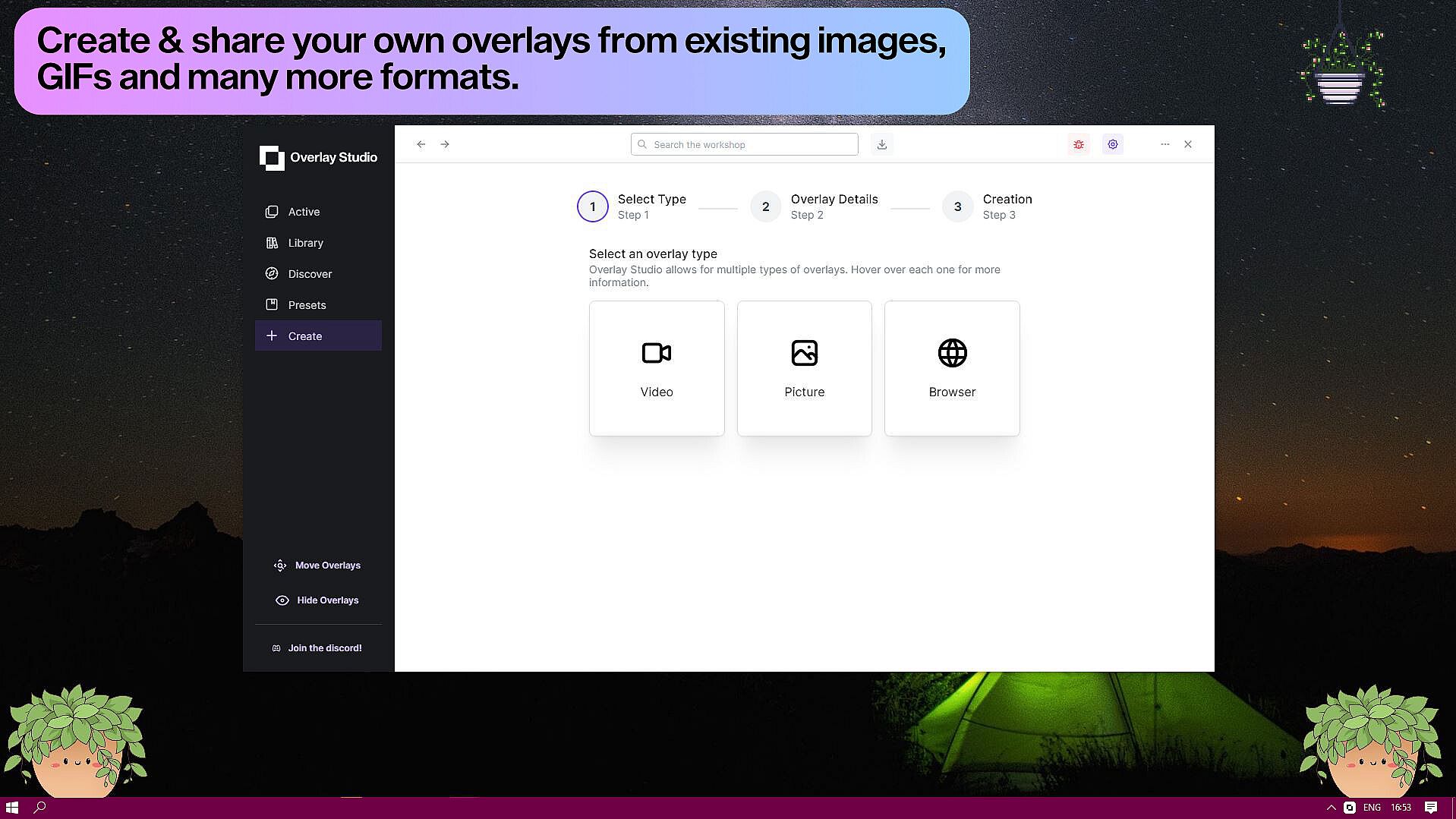 • Create your own video or picture overlays from existing sources. Full support for transparent PNGs, GIFs and WEBMs.