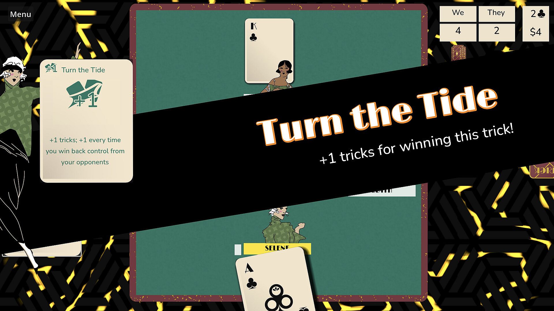 In the gilded penthouses of the Roaring 20s, cardplay separates the elite from the out-of-luck. Dazzle high society with your incredible trick-taking. But don’t get carried away! Your opponents are set on winning at all costs, and have a few special abilities of their own.