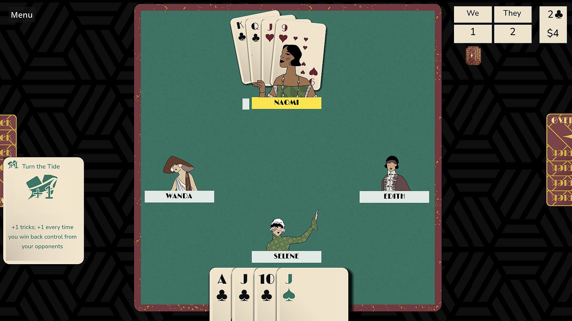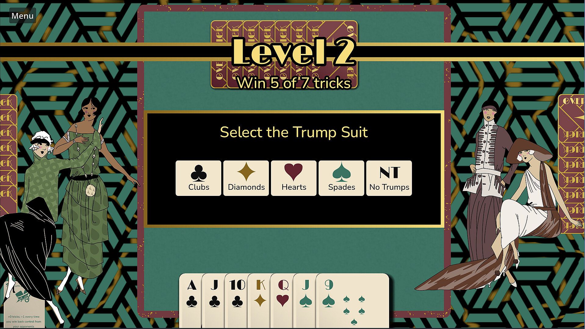 Pick trumps, follow suit, take control, and win enough tricks to make your bid. Overtrick is a trick-taking card game based on Bridge, and similar to Hearts, Spades, or Euchre. Each hand, you’ll have to win more and more tricks to advance. But you’ll also acquire special abilities to help you along the way.