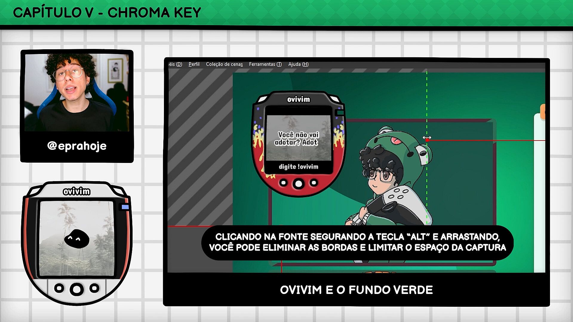 Com a tela verde, você pode usar o recurso de Chroma Key no seu software de transmissão para incorporar o Ovivim na composição da sua live. Se você preferir, também pode mudar a cor do fundo nas configurações, ou usar um papel de parede personalizado se preferir não usar esse recurso.
