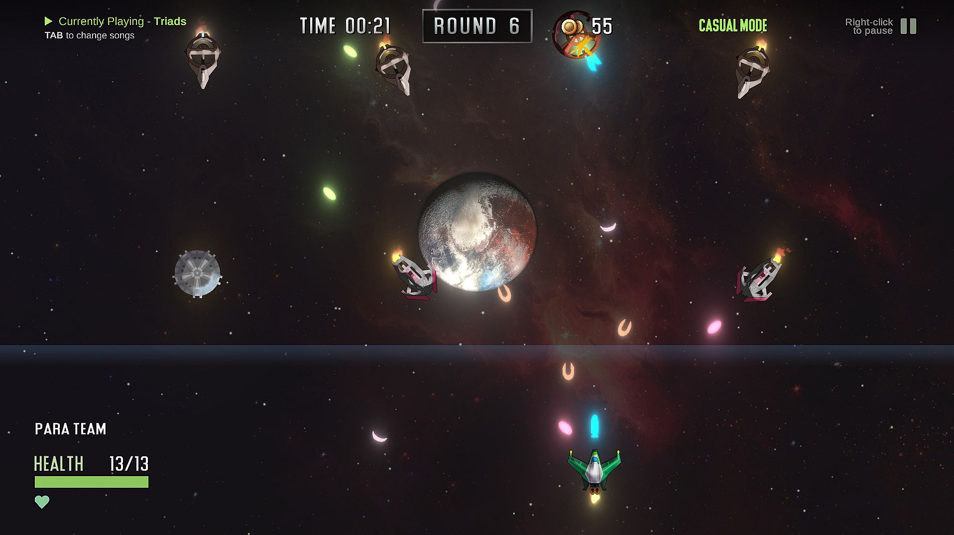 Your dodging and timing skills reward you with higher points at the end of the round, which you spend on creative Upgrades in the Space Shop to boost your spaceship's capabilities. Whether you enjoy burning foes with damage over time, launching shuriken shaped blasts, shooting 4 shots simultaneously in a cone, piercing through enemies or firing at hit-scan speeds, the Shop has your creativity covered.