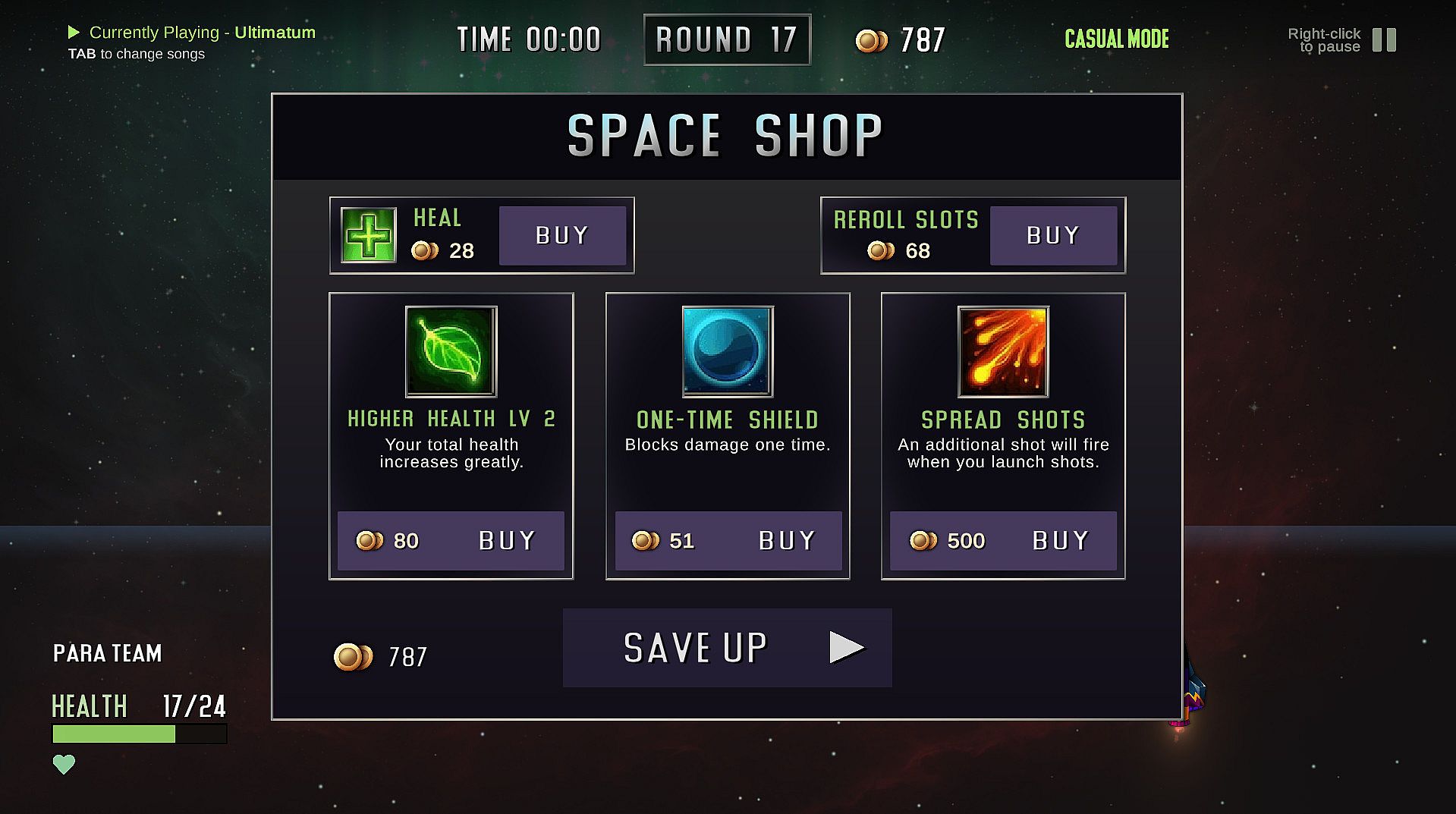 With thousands of combinations, your choices matter in your spaceship's growth and will affect your experience moving forward at harder rounds. Purchase power in small increments each round, or save your points to large amounts to see the Shop offer some higher-level supreme upgrades.