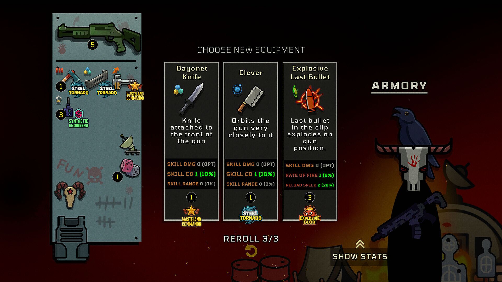 Before every stage, players choose between two new guns, each granting a temporary stat bonus while equipped. This forces constant tactical decisions: