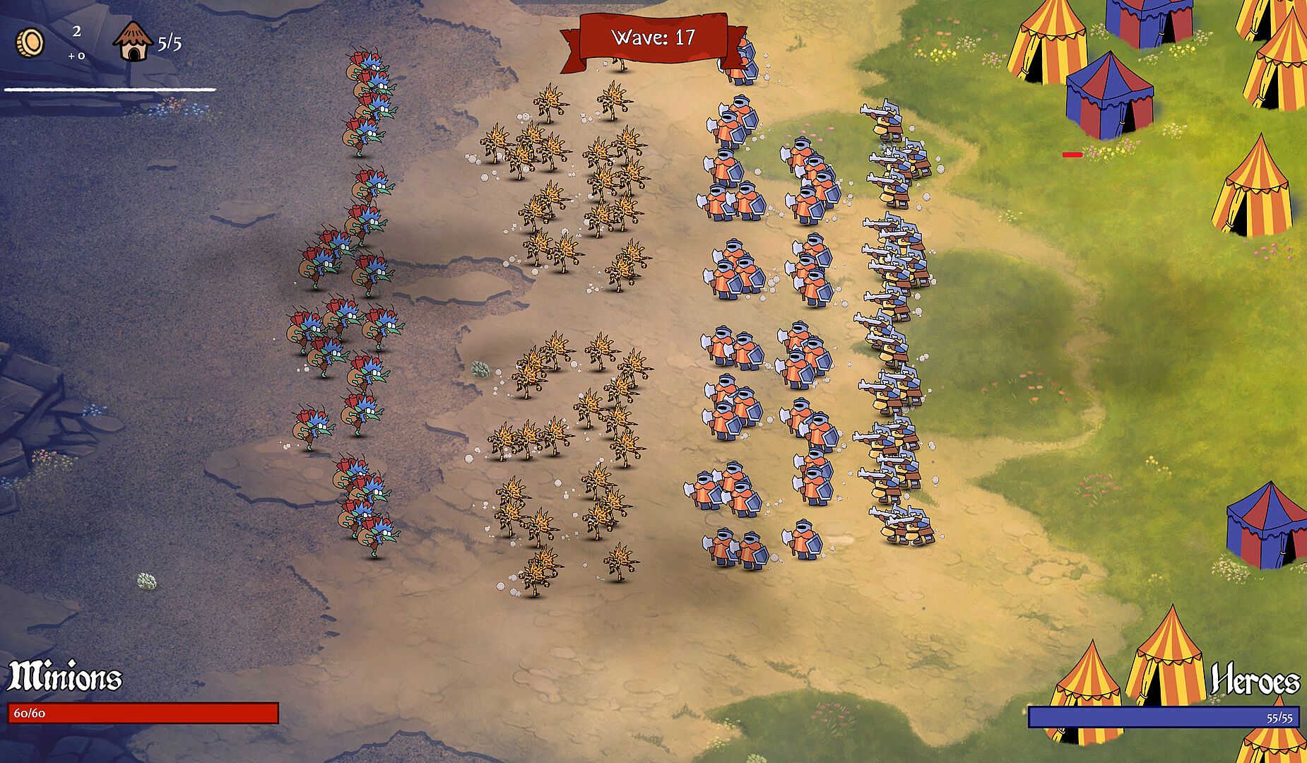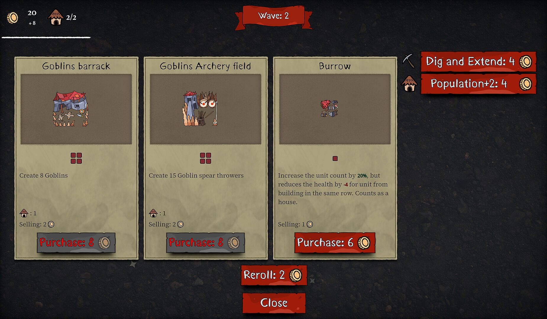 Each building has its own power: Create minions, improve them or produce gold. After every wave, you will be able to buy new buildings from a random selection, dig your lair bigger or make room for new minions. Make the best choice to hold your enemies off long enough.