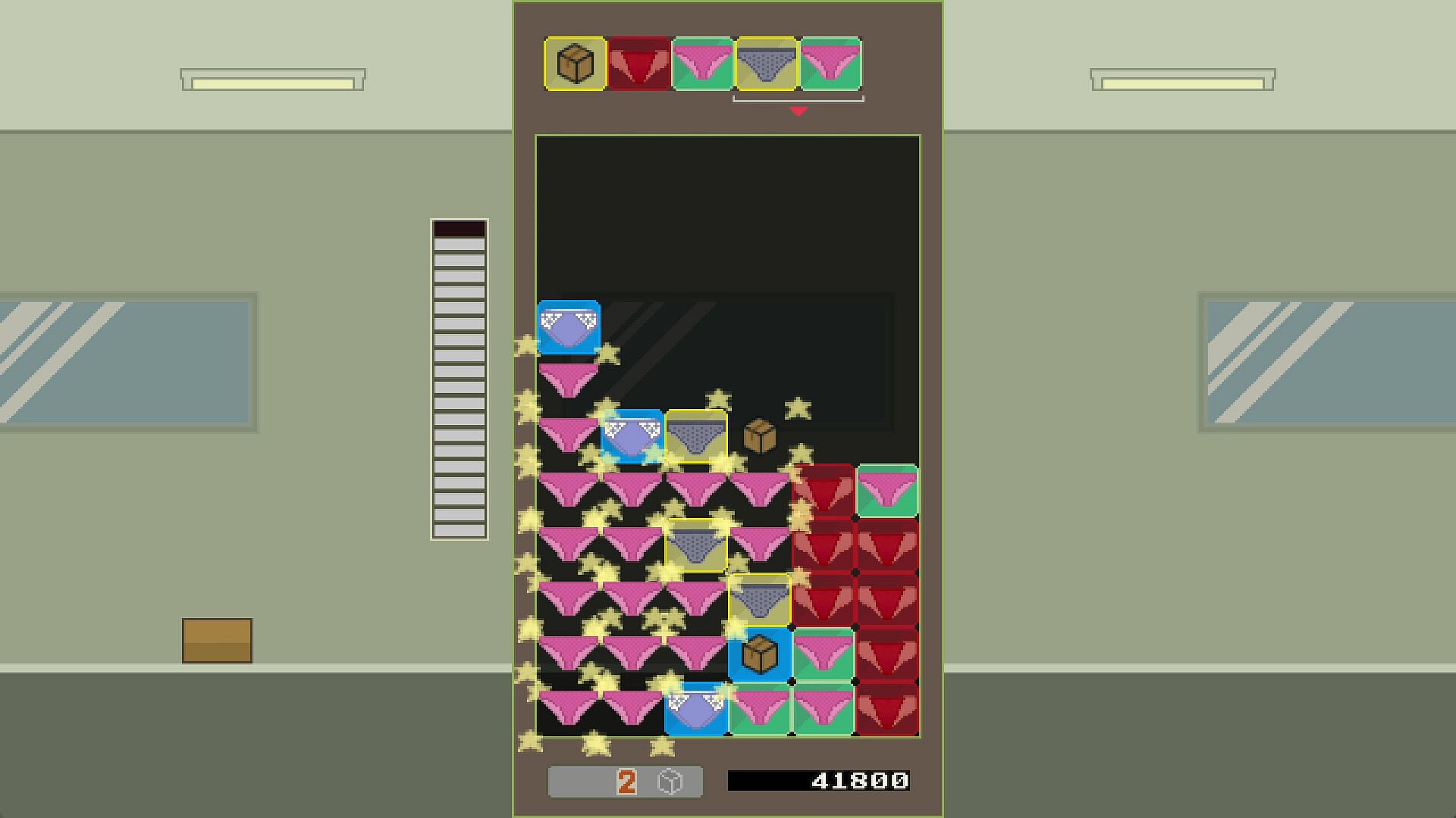Prepare deliveries by aligning underwear blocks of the same type and connecting them with a box block of the same color to make them disappear! The game ends when no more blocks can be placed.