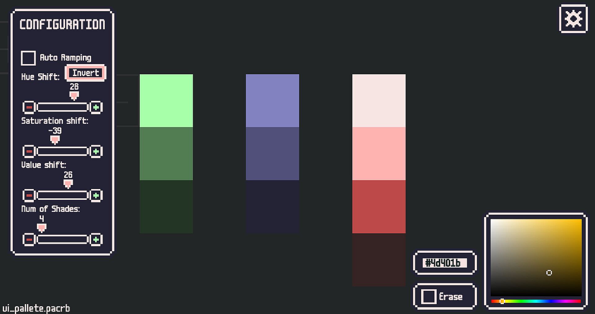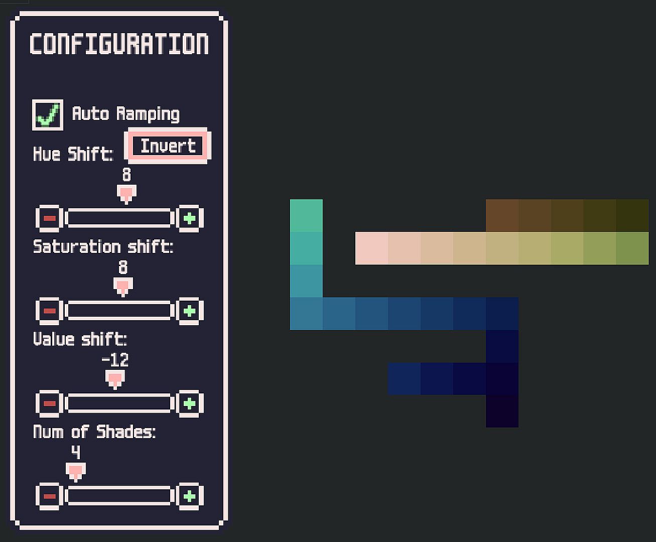 - Color shade ramping with variable hue shifting, saturation shifting, and light intensity shifting.