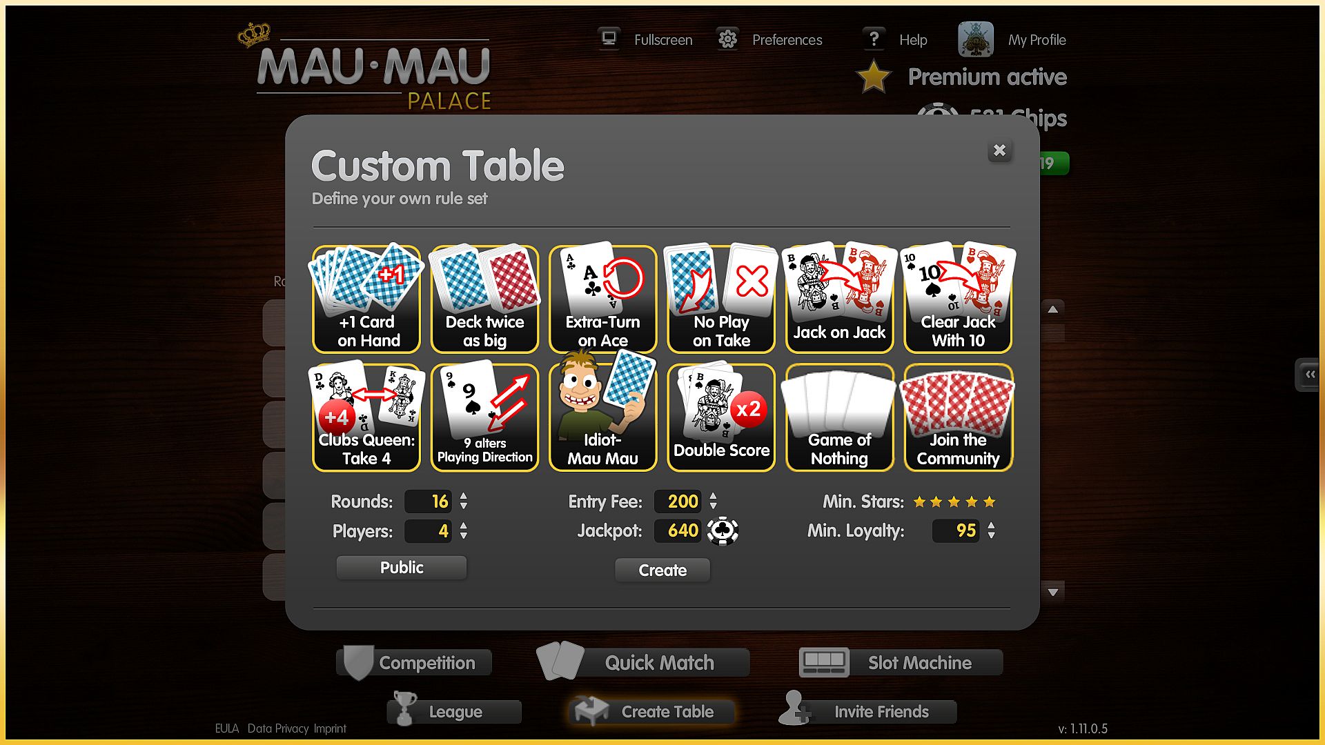 Who doesn’t know it, the game with which you bring your friends to the boiling point? Your opponent places a Seven? Bad for him, you also have one – draw 4 cards from the stack, my friend. Mau-Mau (Crazy Eights) has always put your friendships to a test but also bound them even more. At the Palace of Cards, you will meet new and old friends alike. Don't like our default rule set? Play with “Jack on Jack”, “Idiot Mau-Mau”, "Nines Switch Direction”, “Extra turn on Ace” and many more. We don’t really care, as long you have fun. We promise you will.
