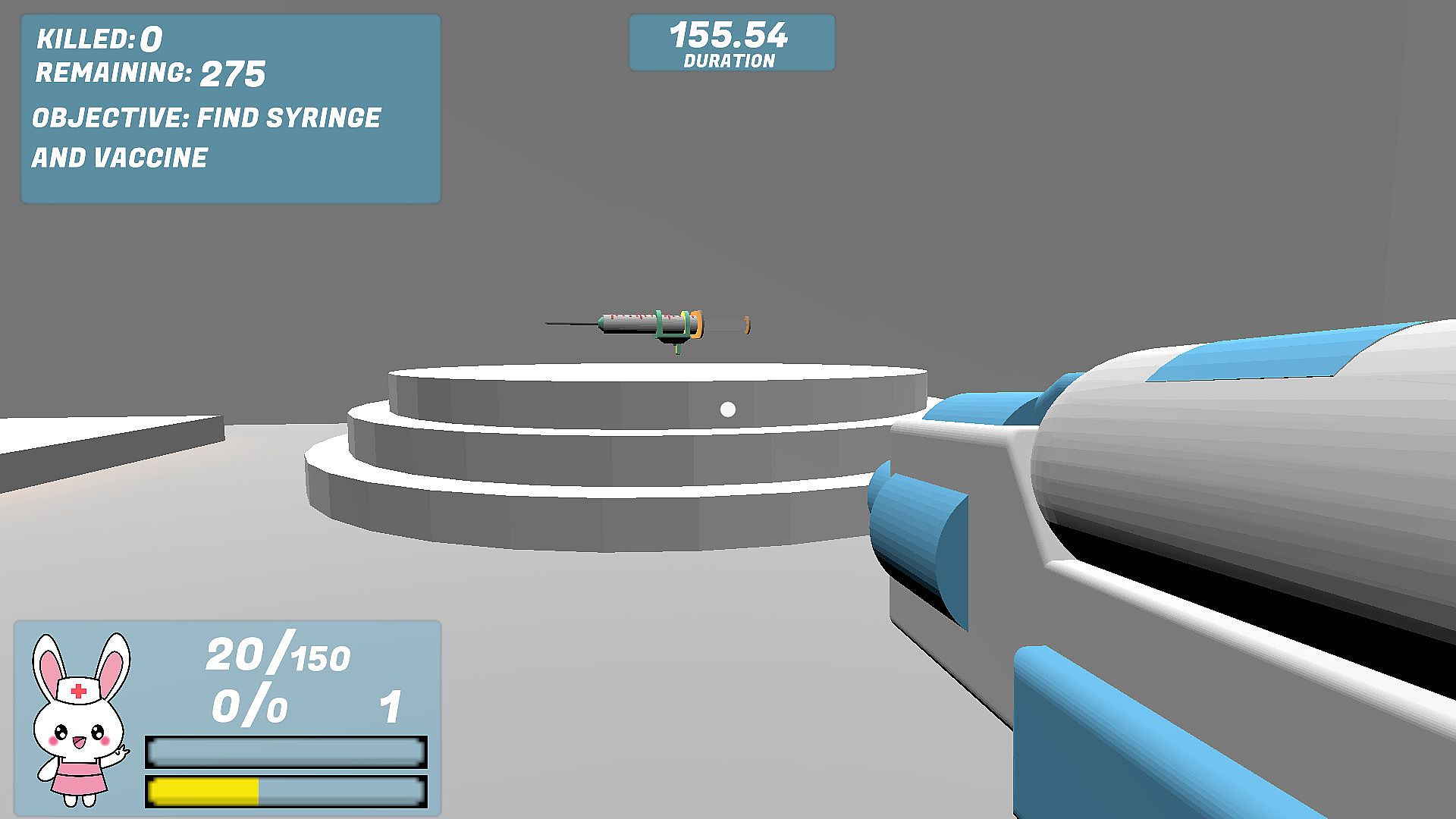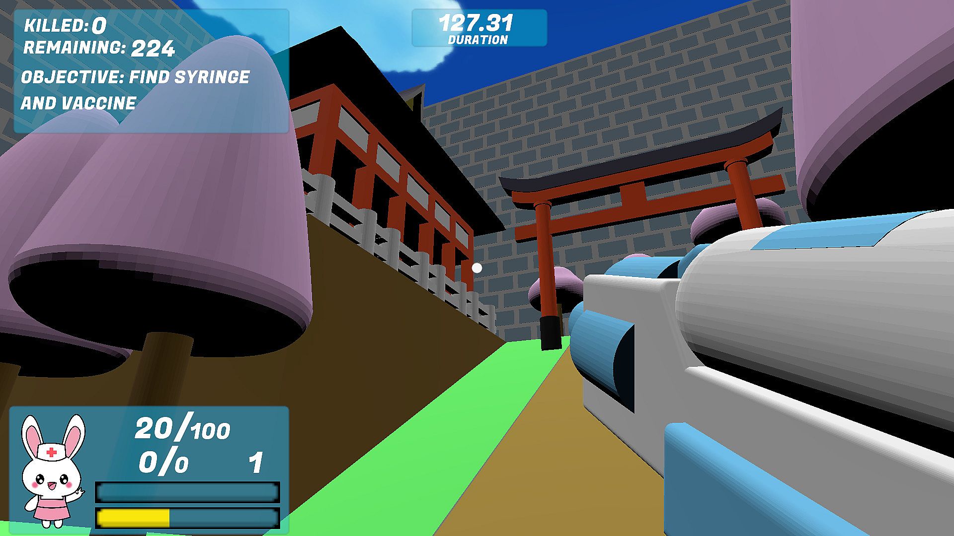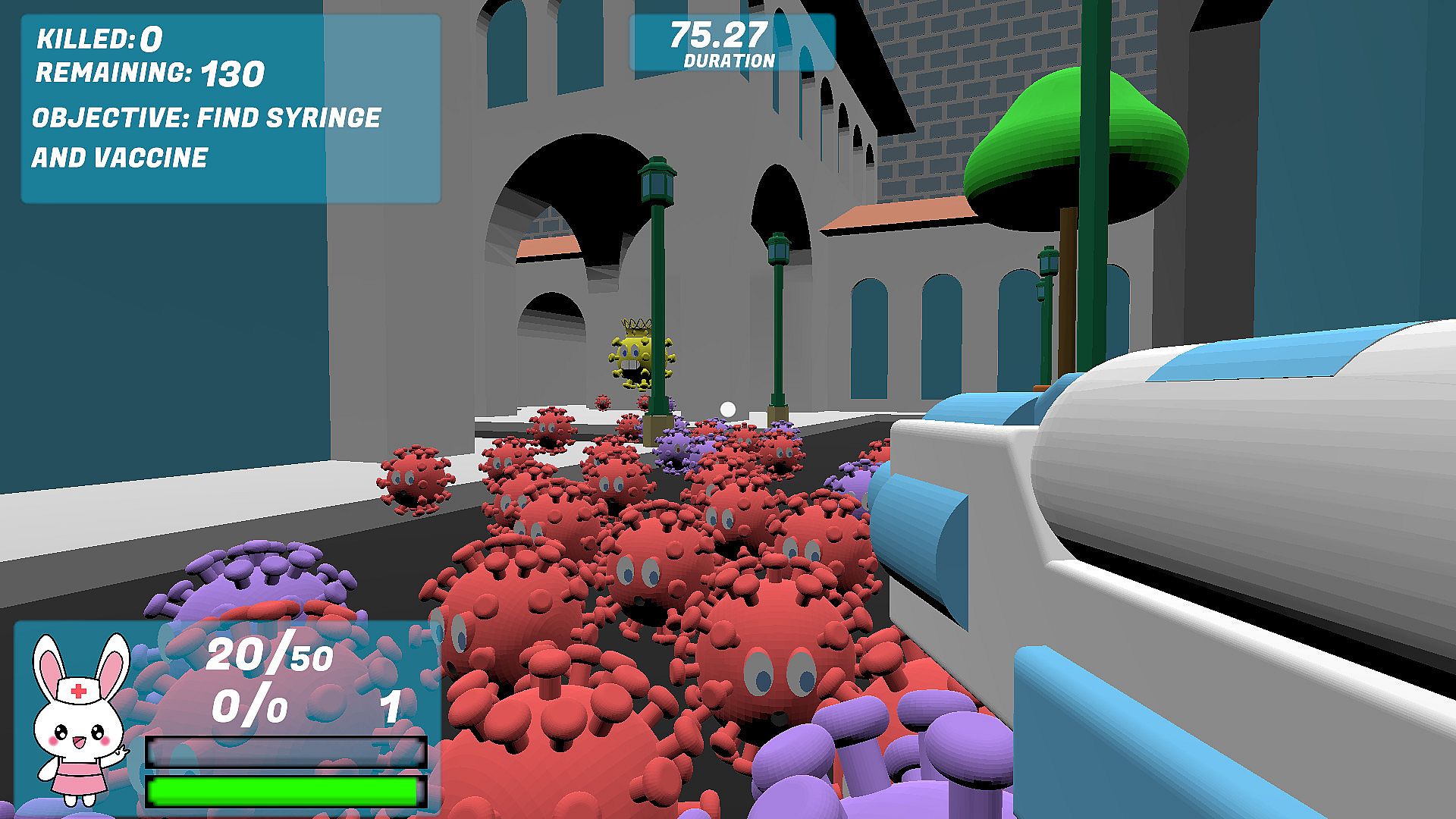 Pandemic Bunny is a cute, fun, and lighthearted FPS mini-game where you can fight the global pandemic both in the game as well as in the real world. Explore your way through the city as Nurse Bunny, fighting with your trusty hand-sanitizer gun, on your quest to find the vaccine. Use the vaccine to eliminate all the Queen Viruses to halt the creation of more viruses. Finally, save humanity by successfully sanitizing all remaining viruses throughout the city. Keep your health, armor, and ammo up by collecting toilet paper, face masks, and hand sanitizer scattered throughout the city. Remember that each purchase of Pandemic Bunny supports charities fighting to aid those negatively affected by the current global pandemic. Have fun and stay healthy!