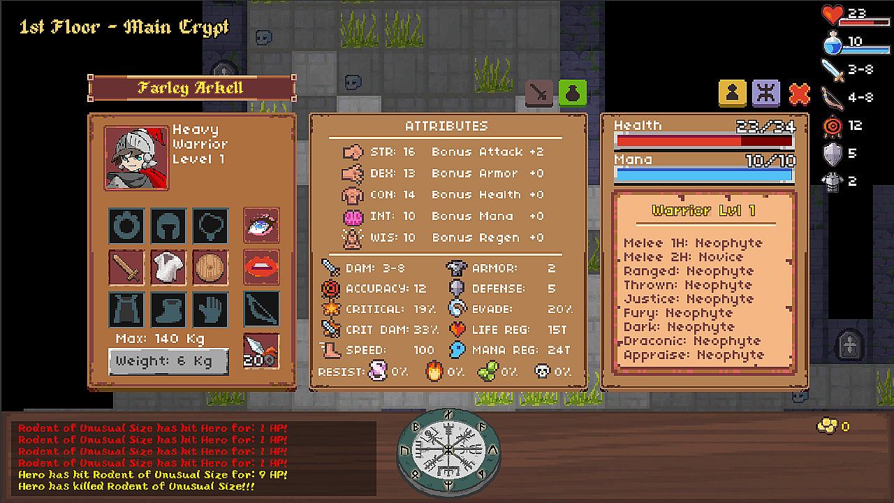 Dynamic turn-by-turn roguelike gameplay challenges players in the mysterious Dungeons of Cyndaria. Cast spells by drawing runes on a compass with class-specific types like Justice or Fire for Warrior or Mage. Explore four biomes filled with 60 creature types, 120 unique items, and 25 randomized floors featuring permadeath, hunger, and needs like eating or resting to survive. Choose from five classes-Warrior, Archer, Priest, Mage, or Thief-and level nine specializations such as One-handed weapons or Rune type 1 through repeated use, boosted by six talents like Hunter or Runic. Defeat five Dragon bosses to claim hidden runes and sacred seeds that restore divine trees. Classic roguelike fans master its unforgiving depth on PC, where skipping bosses risks true death without proper preparation.