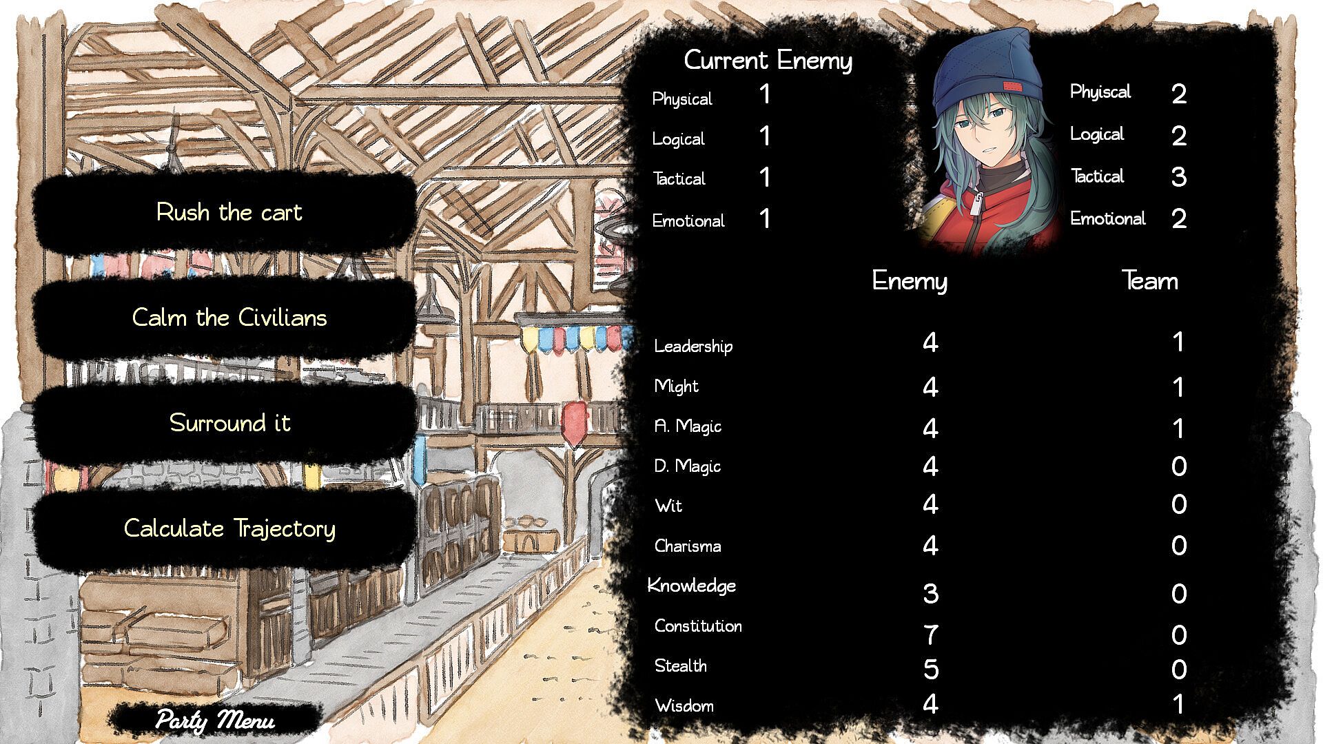 • Text-based quests with EXP progression and party management.