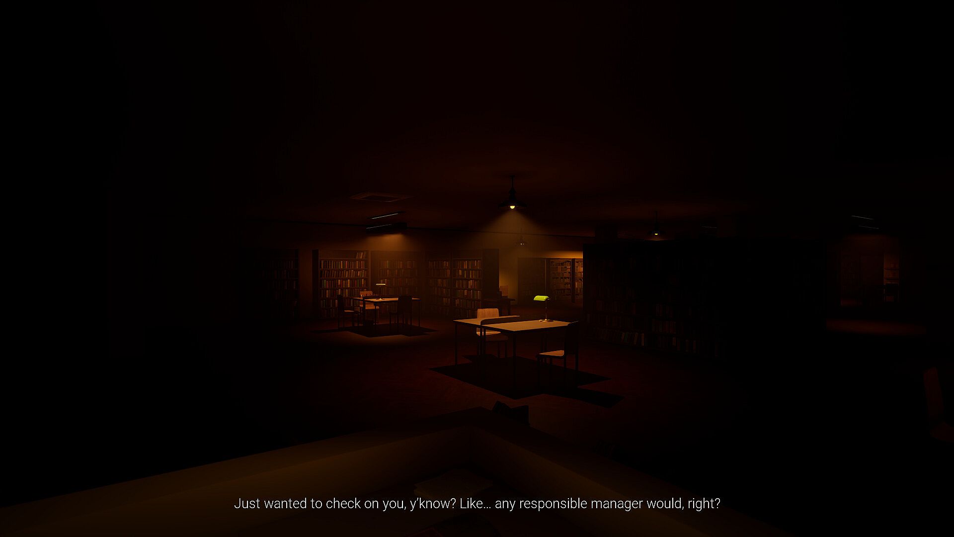 Highly recommended for playing in the dark - the muted orange hue of the library coupled with the dark atmosphere should be very easy on the eyes. An ideal game for those seeking a cozy indie horror experience. Also, headphones are a big must if you enjoy immersive 3D sound design.