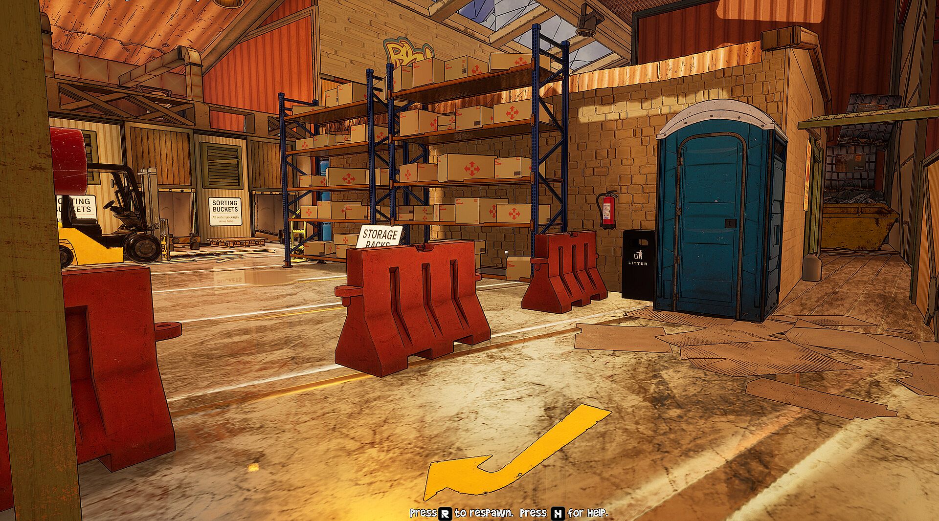 Boxes fly. Boss screams LEFT, MIDDLE, RIGHT.