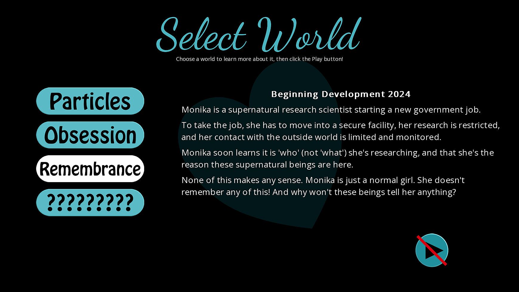 You play the main character of multiple versions (aka Routes) of multiple clusters of reality (aka Worlds, like Obsession!). The characters around you will always be the same people, but the worlds will vary wildly.