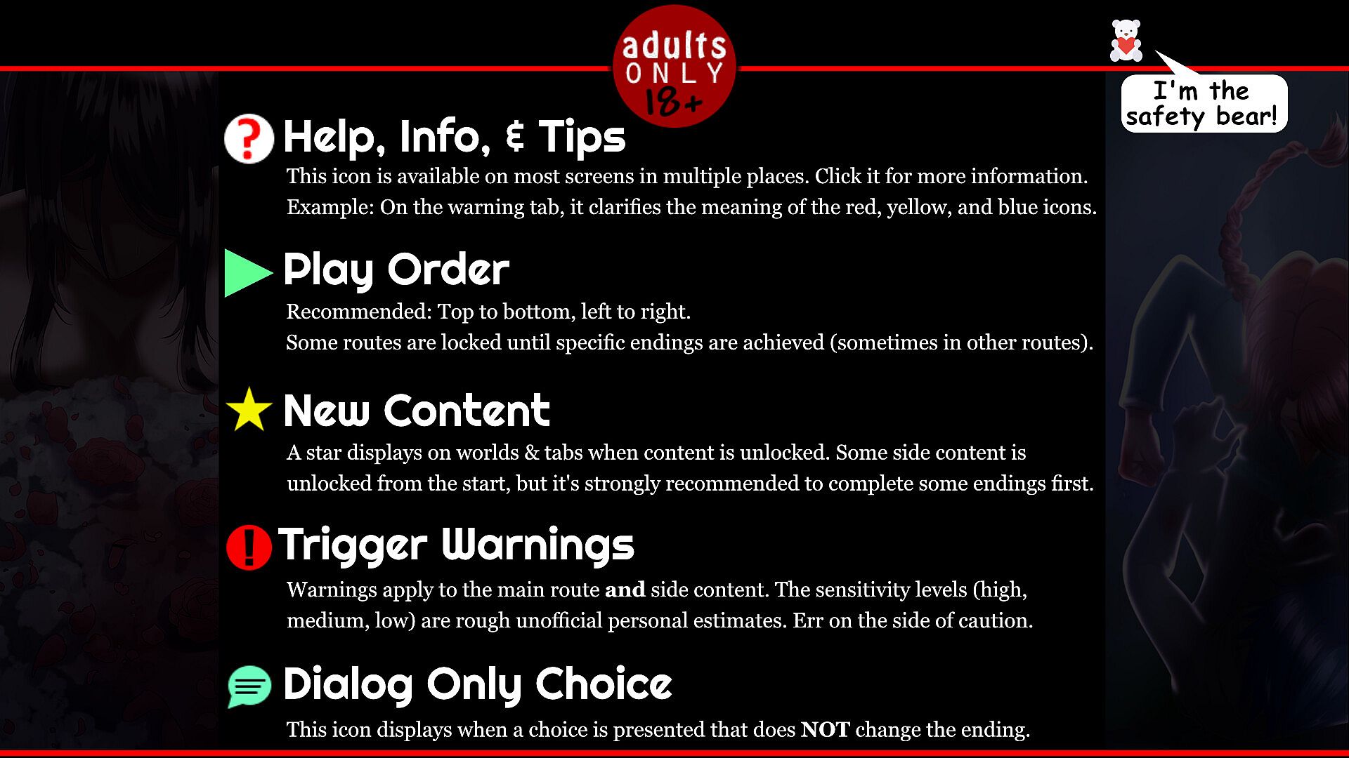 Optional censor settings. These slightly reduce the violent descriptions and skips graphic sex scenes. HOWEVER! These do not disable all adult-content or nudity.