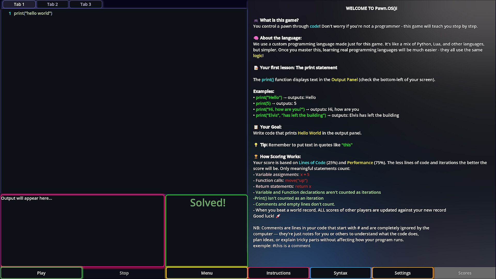 This custom language blends elements of popular programming languages like Python, Lua etc...designed specifically for this game to be easy to learn. Even if you’ve never coded before, Pawn.OS() guides you step by step through interactive, logic-driven puzzles.