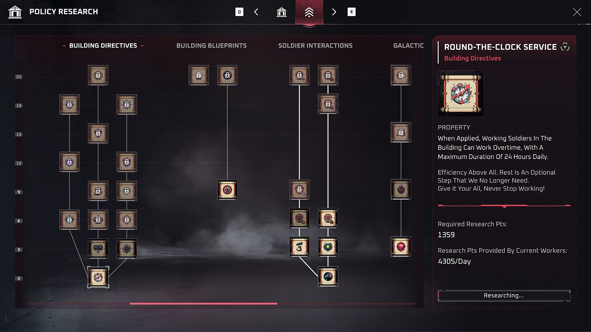 Research new technologies, buildings, and doctrines to refine your colony’s efficiency and tighten your control.