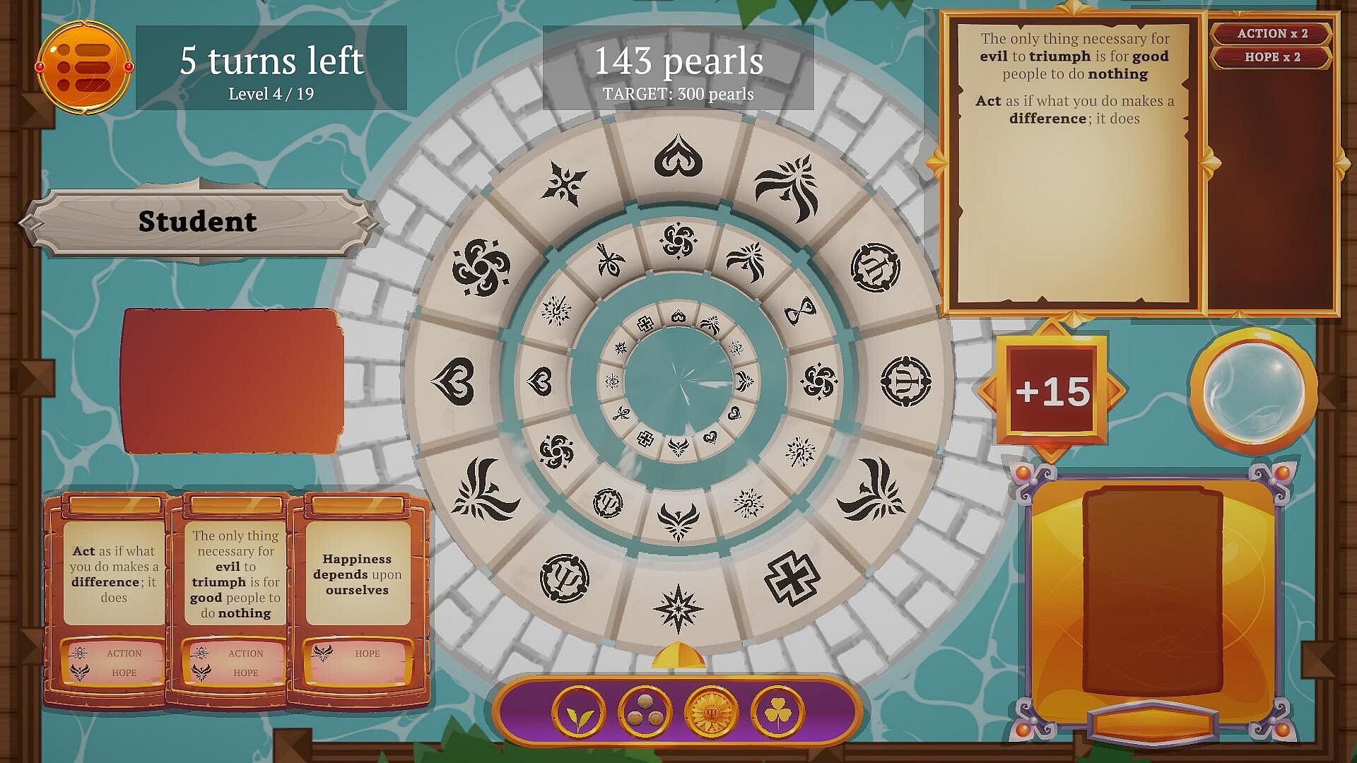 Pearls of Wisdom is a relaxing rogue-like deck-builder with real-world side quests, where you match and combine inspiring and philosophical quotes to create literal pearls of wisdom.