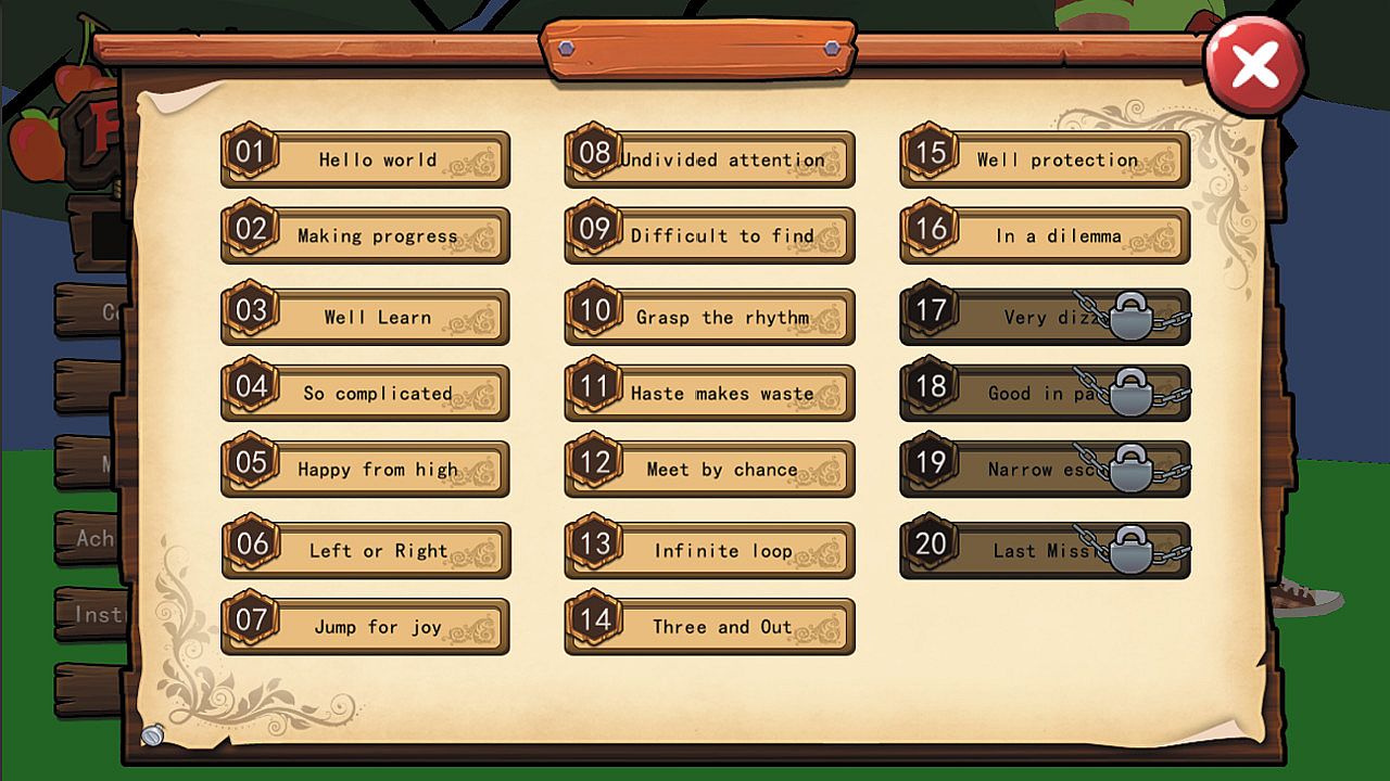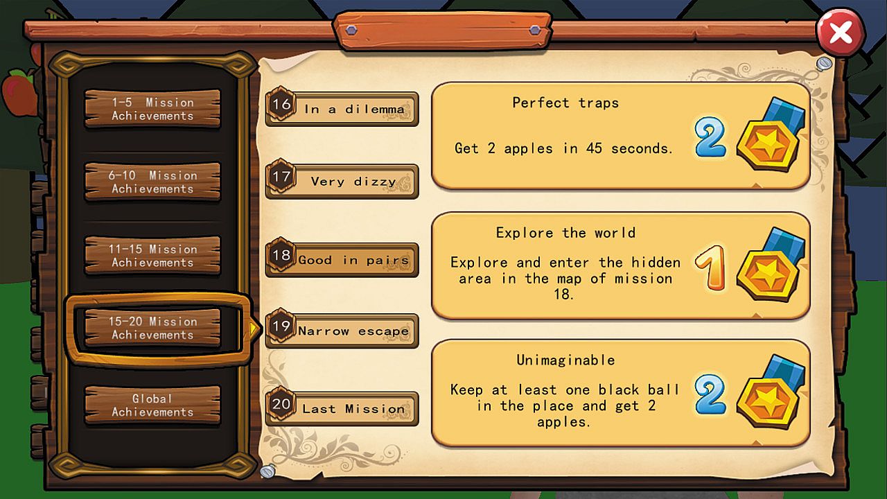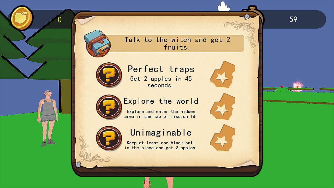 3.There are 20 game scenes, each game scene contains a mission, each mission requires player to collect fruit in certain conditions. Some missions even require player to collect fruit while hiding from the "Black Balls".