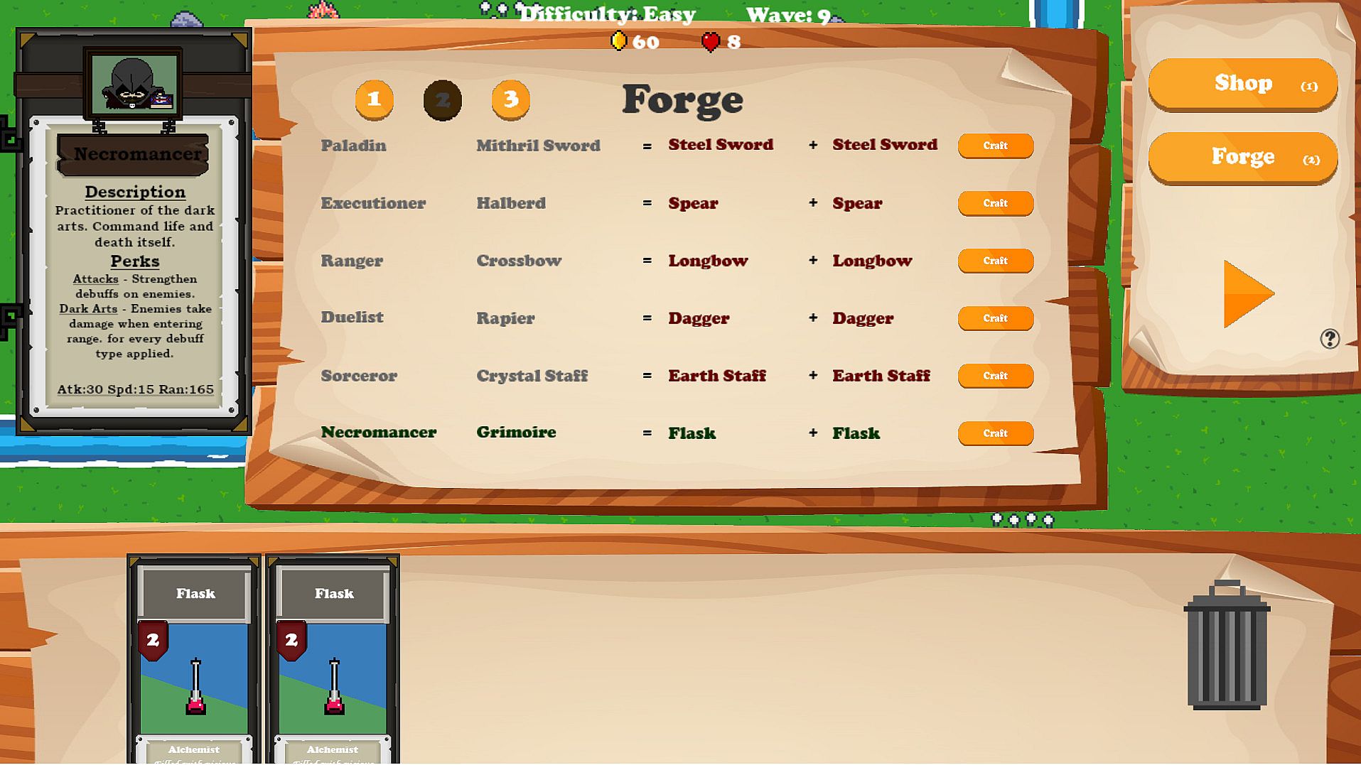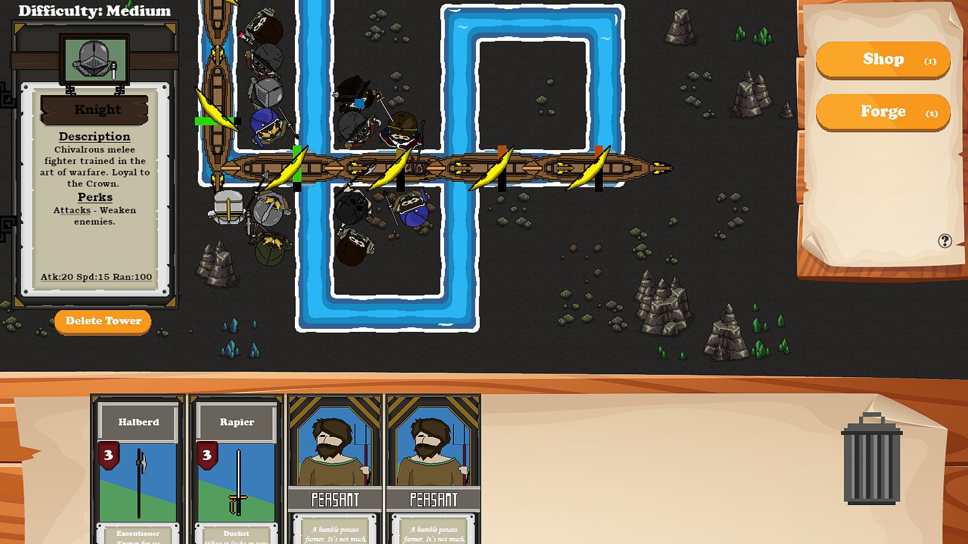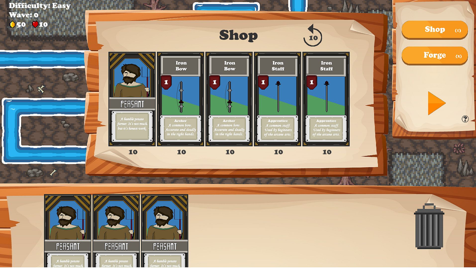 Gold is acquired at the completion of each round and can be used to purchase weapon cards at the shop. Peasants can be upgraded by dragging these weapons onto them.Weapon cards can be upgraded at the forge as long as you meet the requirements.