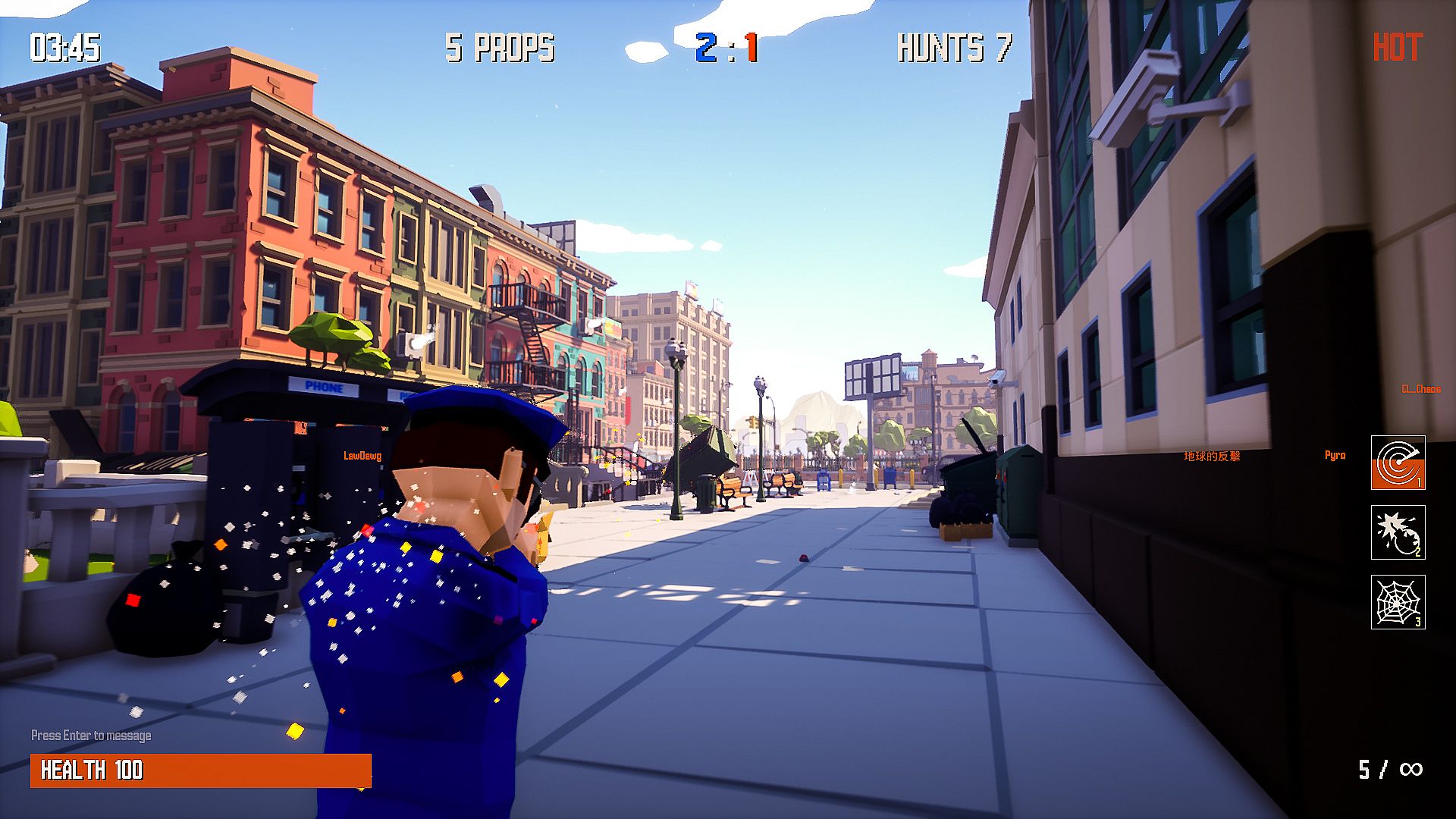 Players armed with special guns — hunters — must find players of opposing team in a limited time.