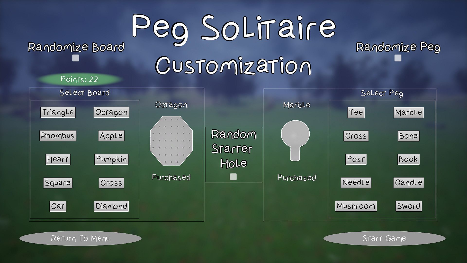 • An option to randomize the peg and board used when playing continuously so as to not play the same board or use the same peg every round.