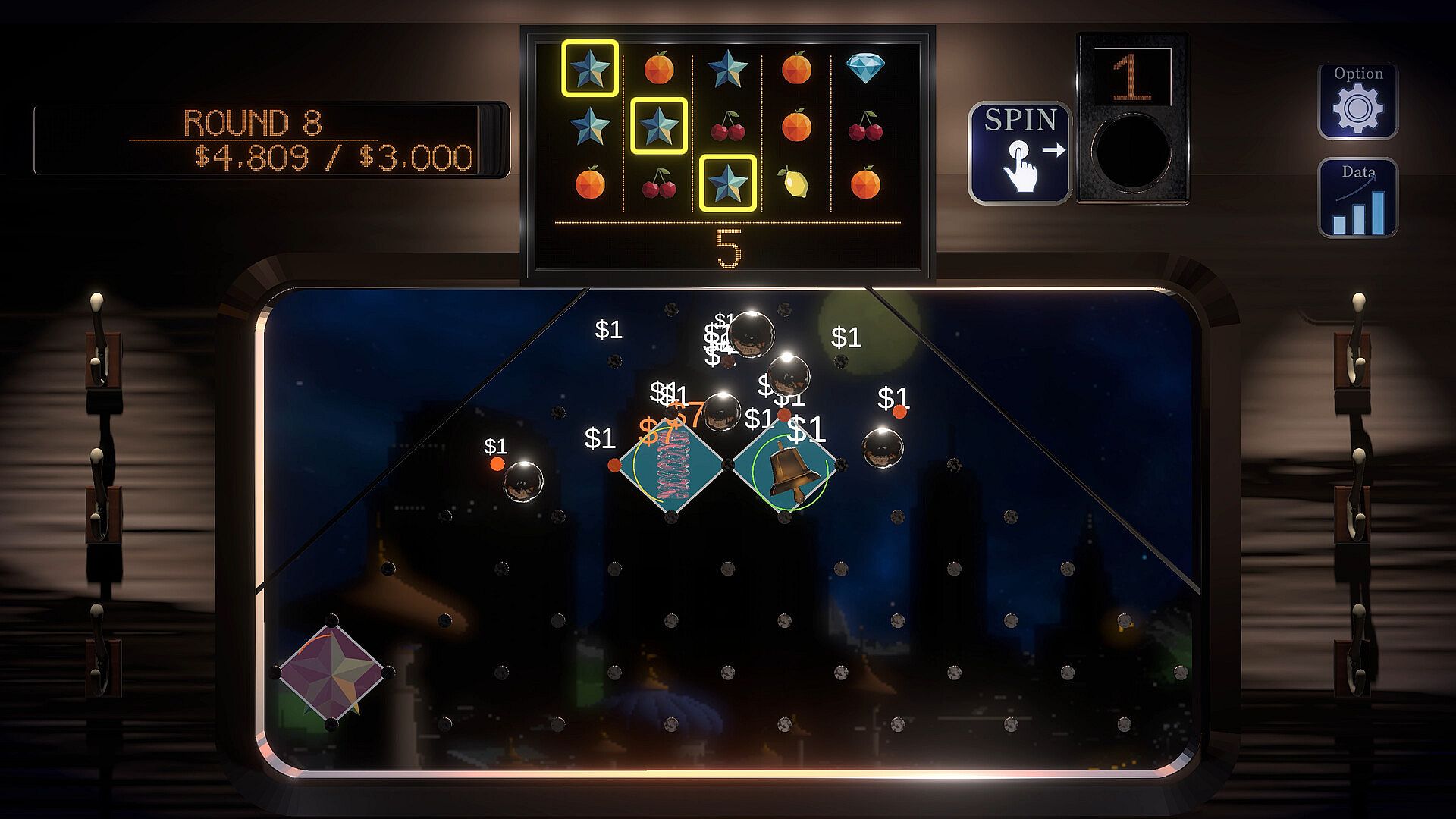 Items can influence both the slots and the pachinko board. Manipulate the odds of specific symbols, alter how balls hit, or change how they spawn. It's not just what items you pick — where you place them matters just as much. Aim for the best possible setup to tip luck in your favor.