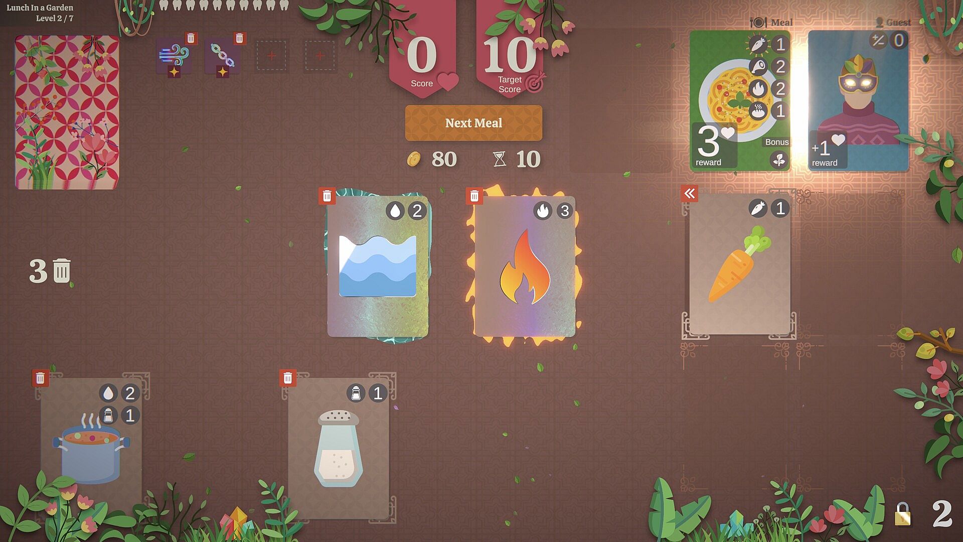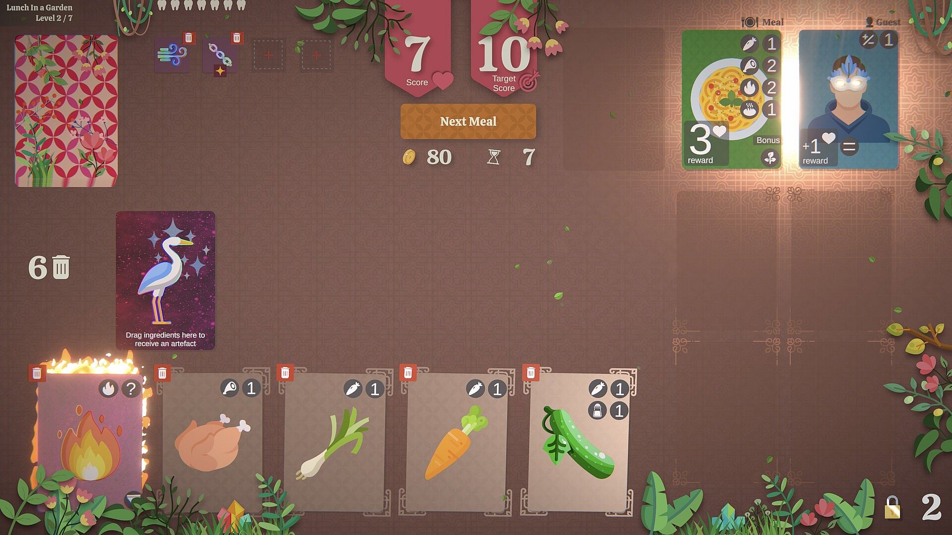 Each round you're dealt a random guest and a random meal. Each guest has their own quirks about how they want their meal prepared. Manipulate the cards in your hand and deck to find all the right ingredients to cook the perfect meal, but make sure it satisfies the guest's needs too! Are they a glutton, an aristocrat, a fussy child?