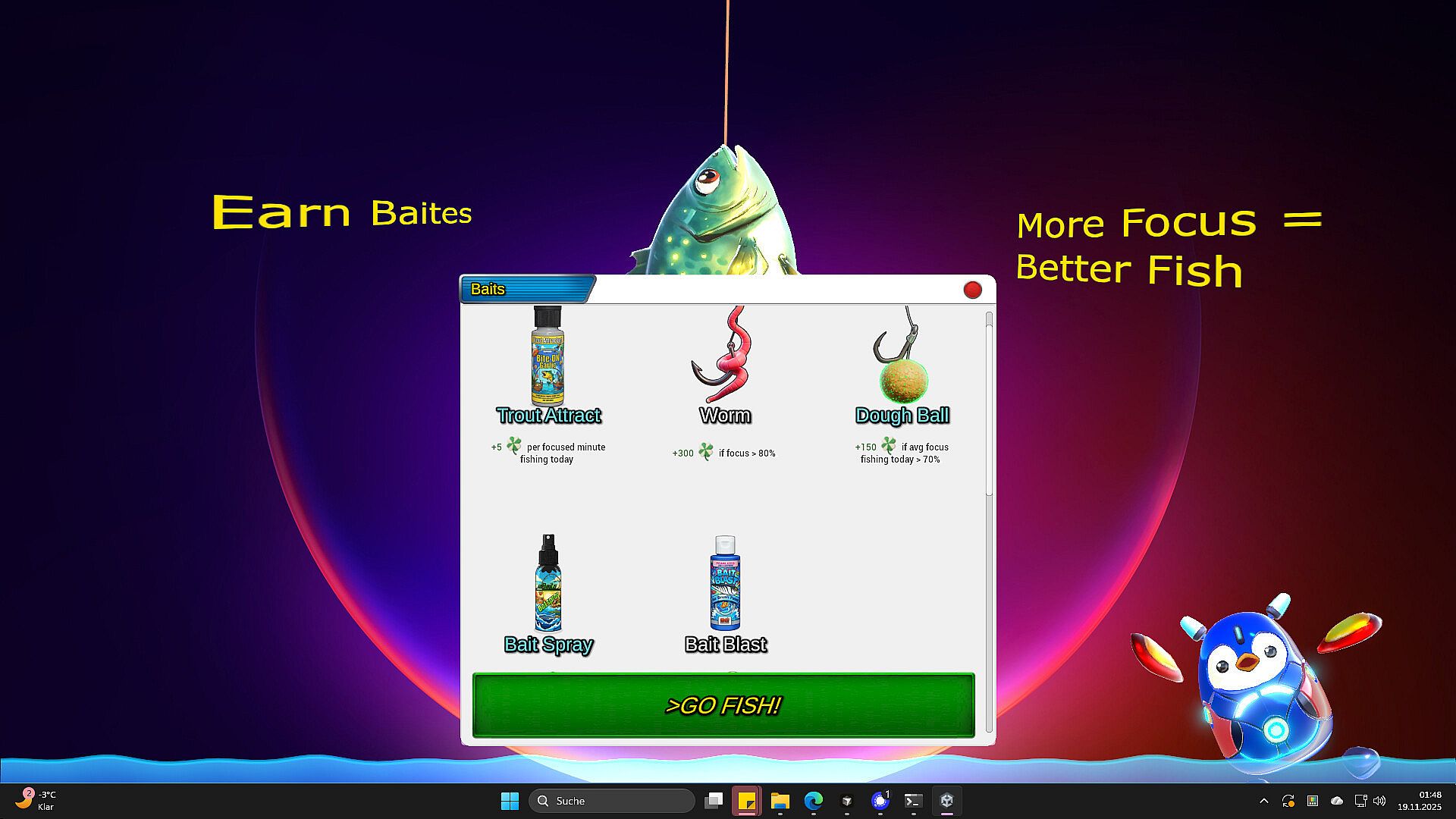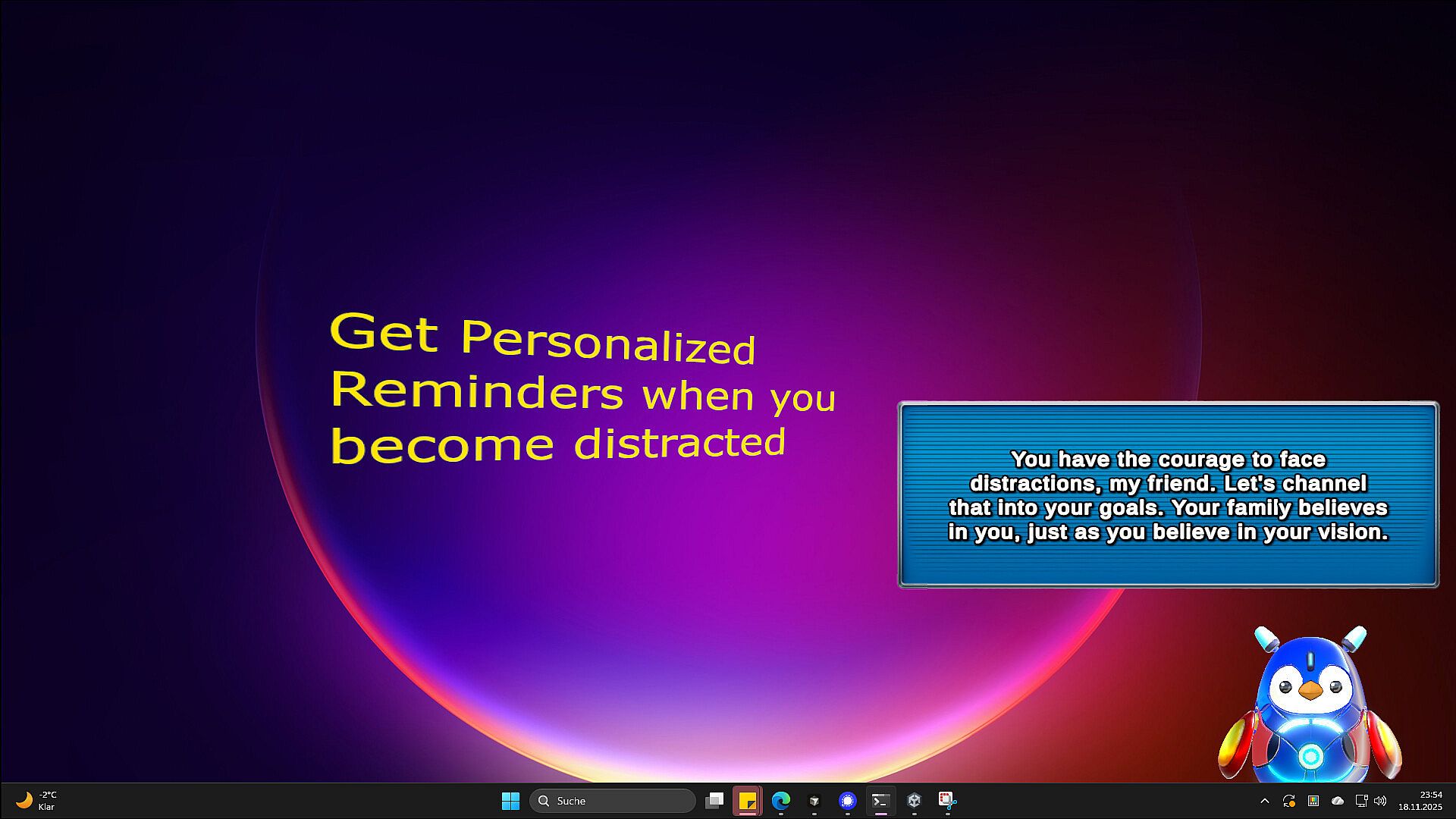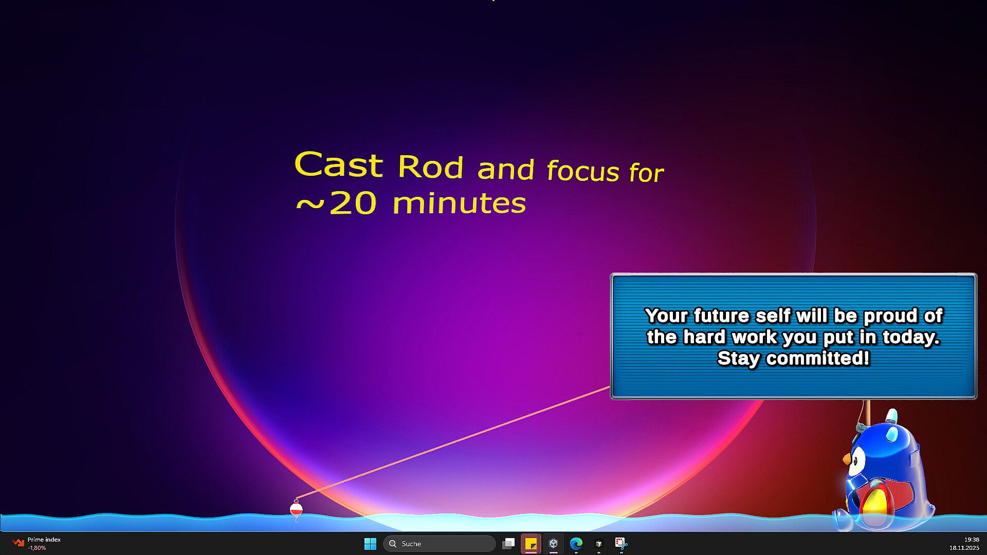 Pengo Friendo is here to help. I’m a cute robot penguin that lives on your desktop. Whenever you get distracted, I’ll gently nudge you back on track. I can remind you why your goals matter or share proverbs and wisdom from the greats who came before us. We can even go fishing together: you focus for a set amount of time, and I’ll catch a delightful fish as your reward.