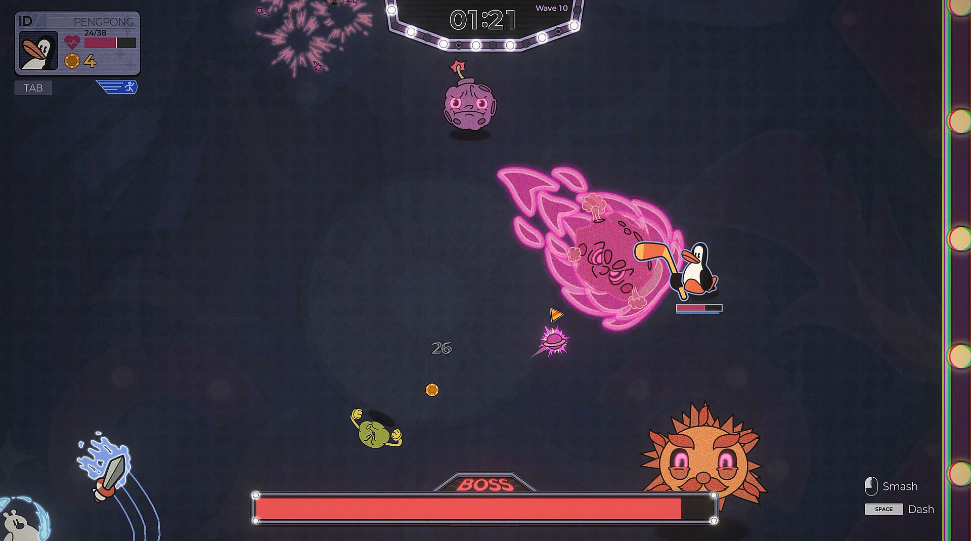 You play as a penguin armed only with a hockey stick, deflecting every weapon scattered on the ground to fend off swarming enemies. In this cute yet dangerous vintage cartoon world, every swing of your stick could decide your survival.