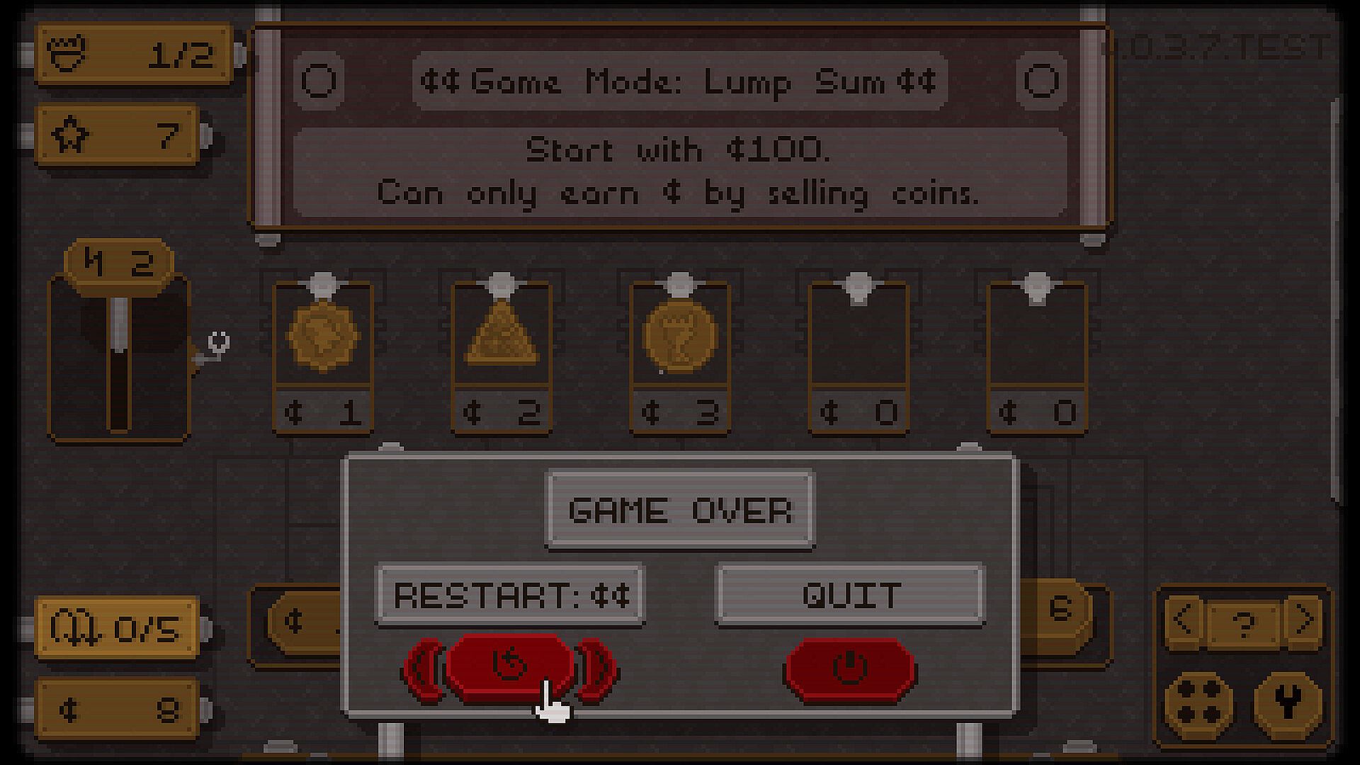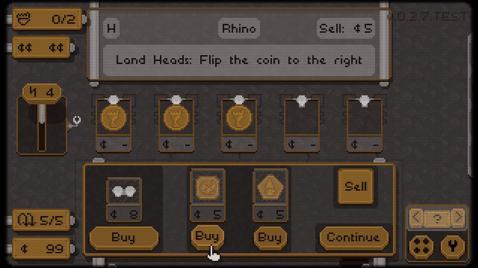 Beat the heads quota each round to advance through the game, collecting unique coins with unusual synergies as you play. Pull the lever to zap coins, guaranteeing their next flip will land heads. Beat a quota of 12 to win Pennies 12!