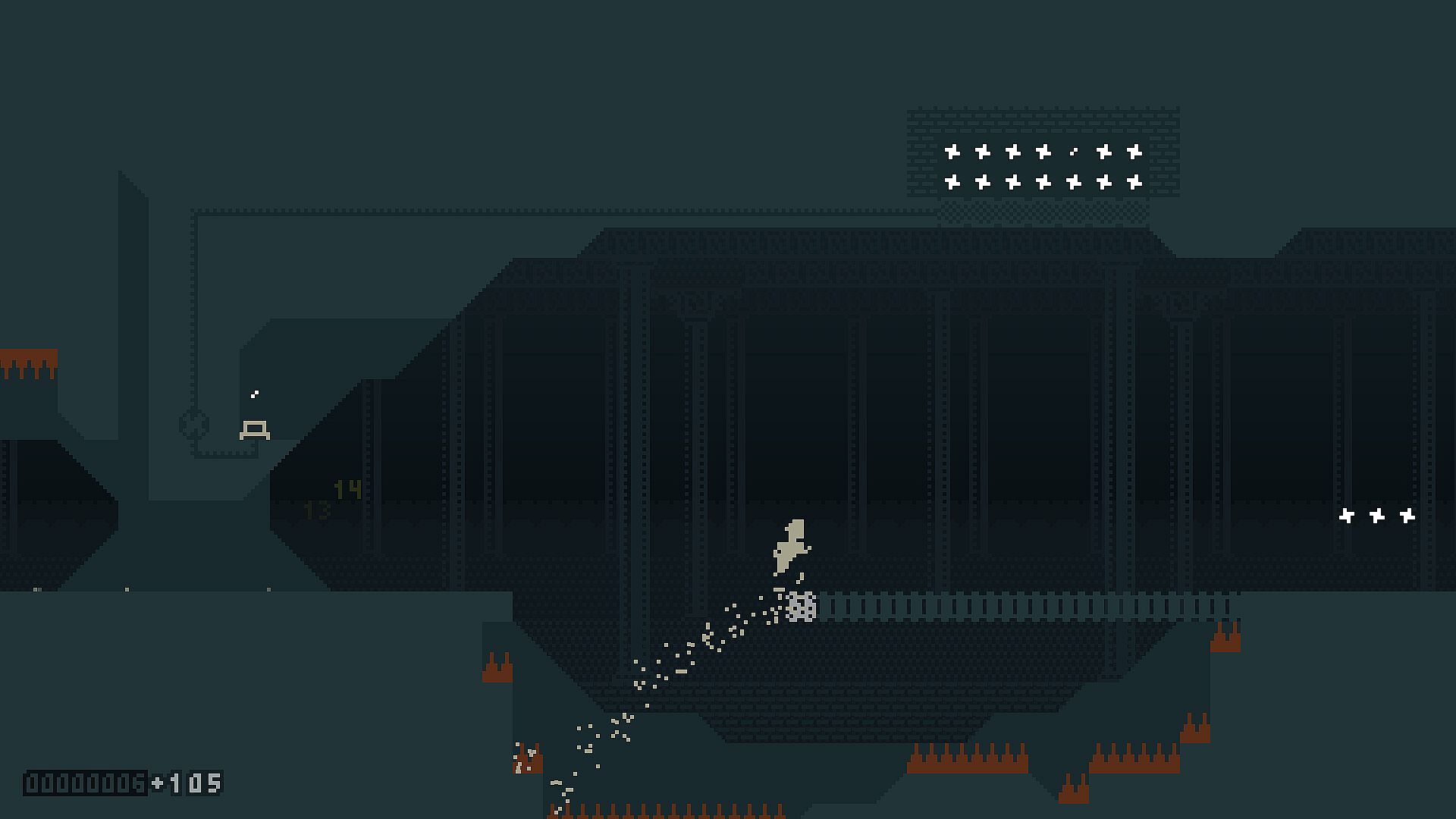 Perennial uses a custom engine to render pixel graphics with integer scaling at high speed, supporting any refresh rate or aspect ratio up to 360hz and 21:9 ultrawide. There are many interactive elements: ladders, doors, water, breakable and bombable bricks, collapsing platforms, togglable walls, falling spikes, toggle spikes, tracked elevators, remote input triggers, boats, conveyor belts, flowing water, carriable and non-carriable crates, rolling rocks, keys and locks, cloners, lava, lights, sounds, and a Turing complete electrical system inspired by the wireworld cellular automata.