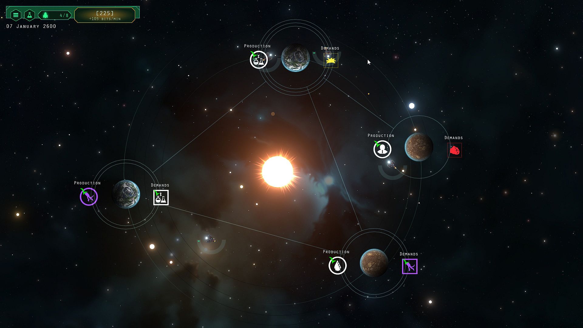 The mechanics of the game are straightforward: define a trade route from one planet to another, shipping a produced good to a planet that demands it. However trade routes cannot cross, and your company can only operate a limited number of ships. As you upgrade planets, you'll need to start transporting new goods across a densely established network to unconnected planets that are difficult to reach now. You'll drop off and pick up goods at many stops before they make it to their destination. Deciding how to allocate and transport limited resources in an dense ecosystem is a challenging puzzle that will entertain for hours and hours.