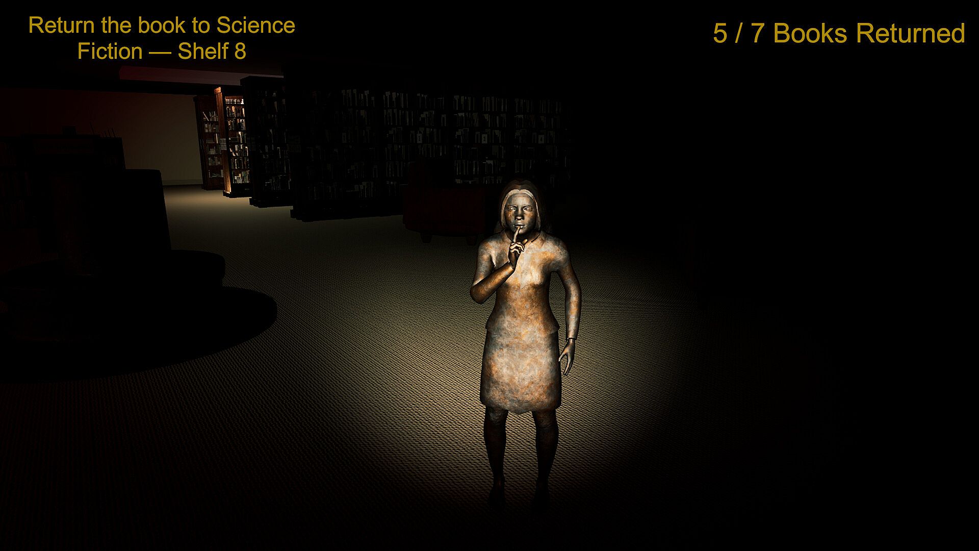 Your goal is simple: pick up a book from the return slot, find its shelf, and return it. But with every book, the difficulty escalates as the Wardens grow more relentless. Every book raises the stakes: shelves are sabotaged, lights go out, and statues come to life. Can you return all seven books before the Wardens return you?
