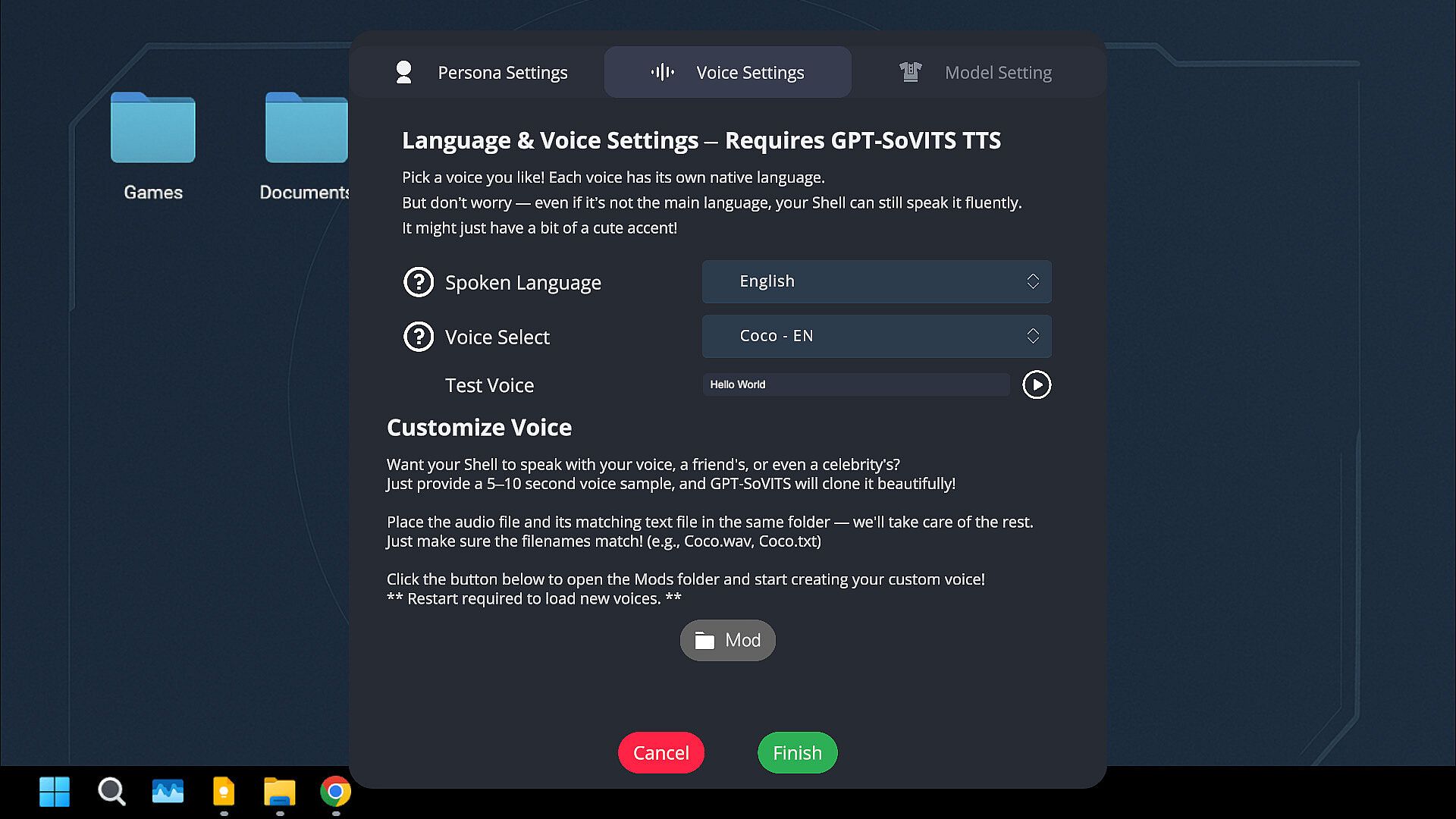 • TTS voice synthesis support — choose from built-in voices or set a custom one