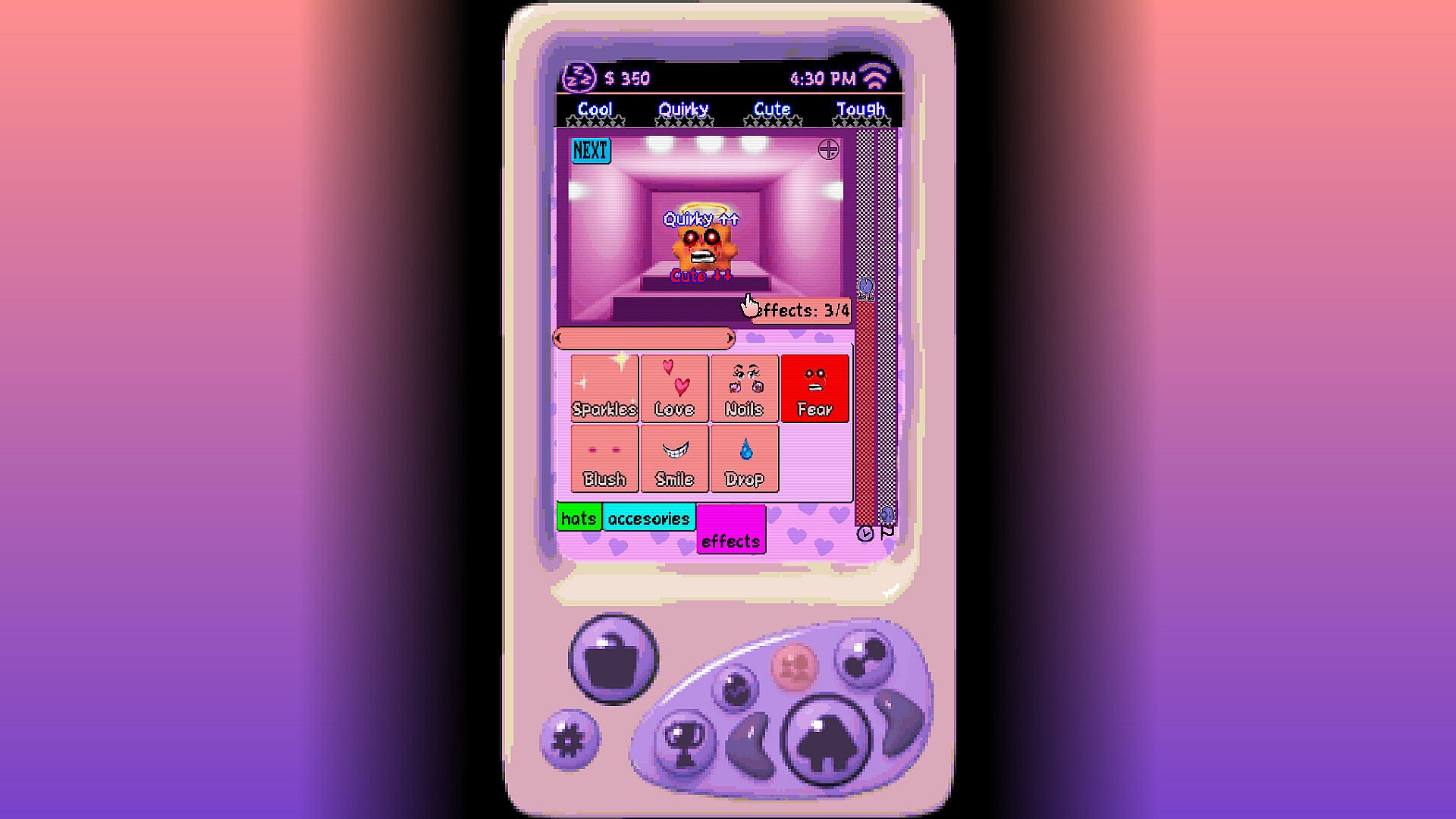 Name your PET, decorate their space with furniture and backdrops, and buy them cool gear and accessories at the Shop. Or gamble away your earnings in a Gacha machine to earn different colours, skins and other decor for your device.