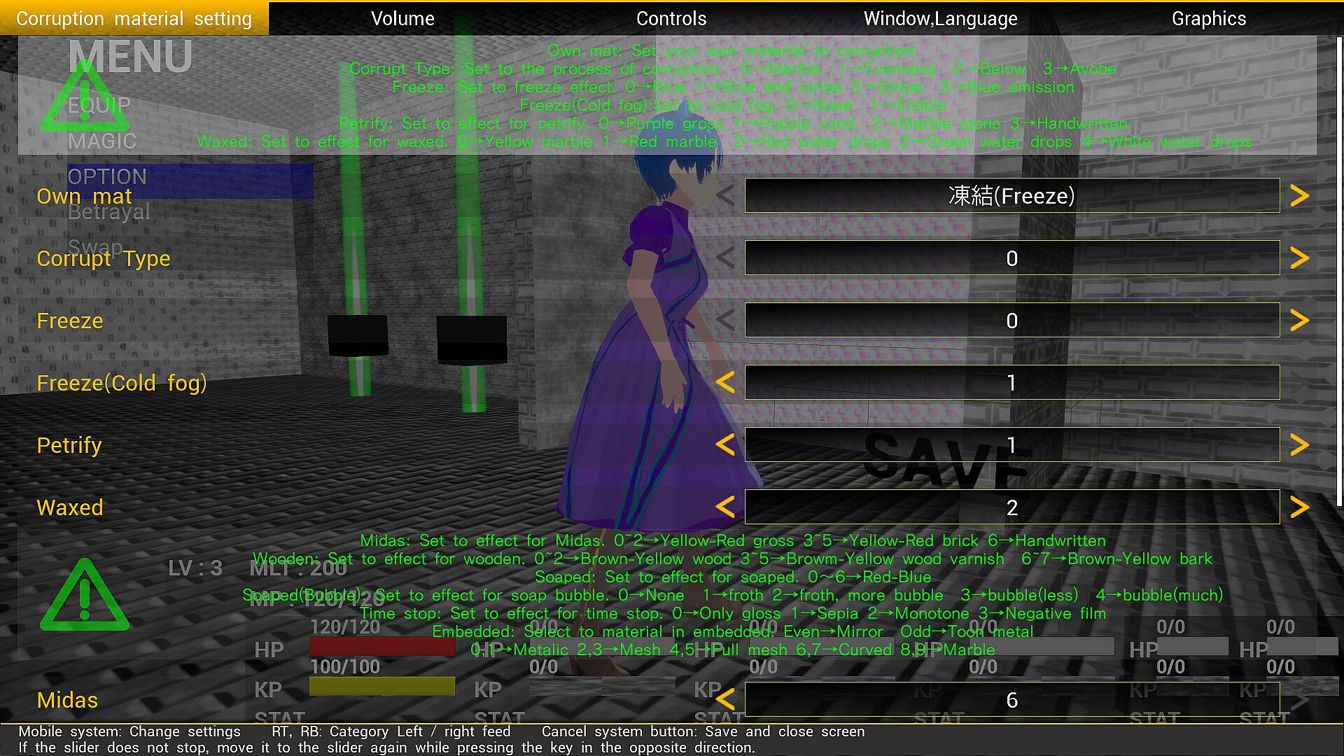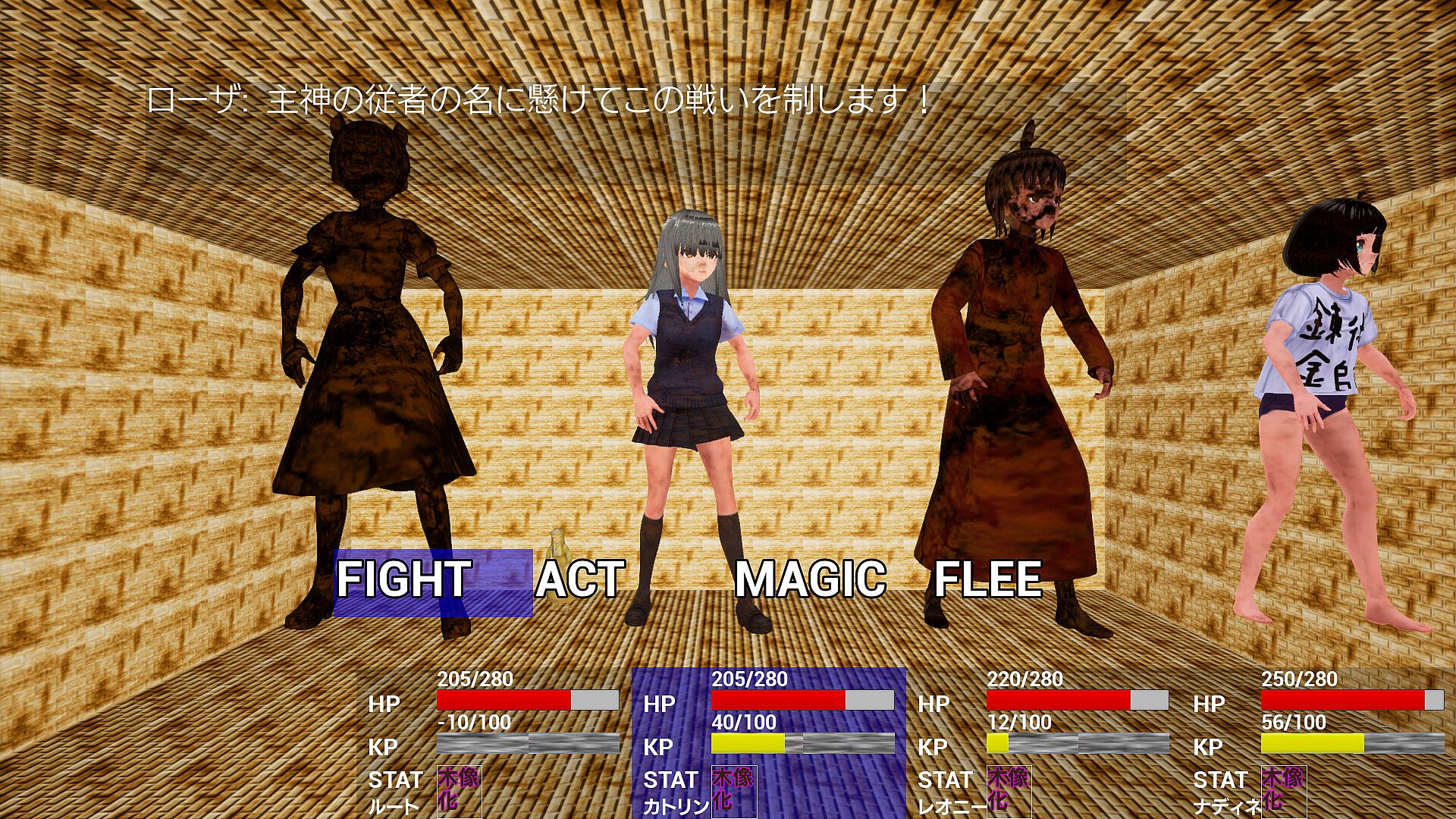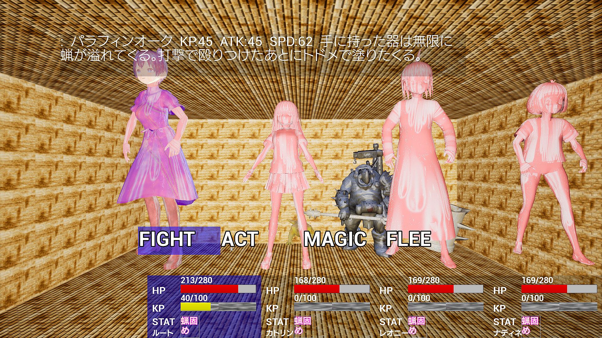 Bishoujo characters transform into materials like ice, stone, wax, gold, wood, or soap through abnormal conditions, with erosion spreading on each hit to slow animations and heighten attack avoidance challenges. Players press buttons at precise moments to strike while dodging enemy assaults in a style echoing STG mechanics, adapted for RPG pacing from a notable indie title. Human bosses yield via gimmick solutions instead of full defeats, branching endings based on choices. Root, wielder of rare freezing magic, enters a cryptic consolidation death game after abduction, controlling character routes amid Japanese anime-style models. Equipment and levels adjust difficulty for STG newcomers, with varied erosion patterns, material-specific expressions, soapy foams, and cold air effects. Short playtime around one hour suits fans of quick, condition-focused indie action RPG sessions.