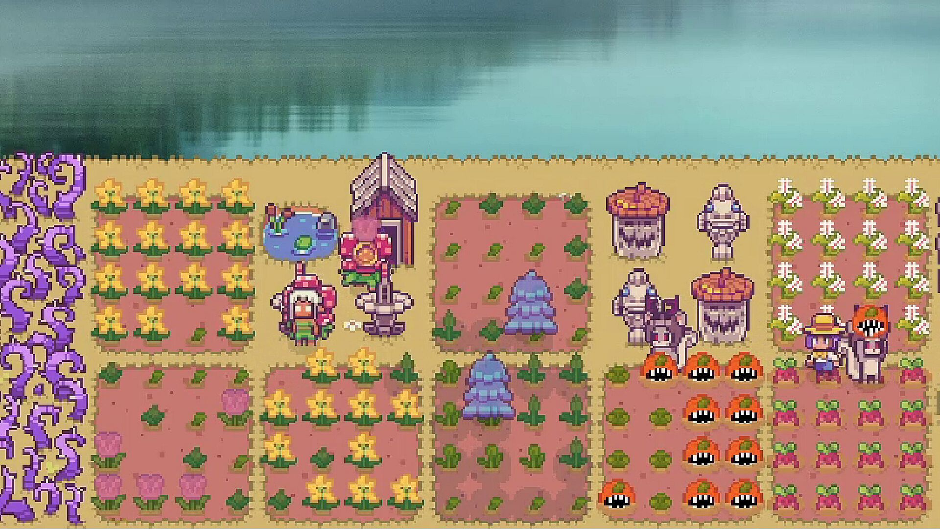 Harvesting horrifying crops and slaughtering creatures is rough on Petunia's fragile mind. Plant flowers and decorate your farm to keep her from going insane.