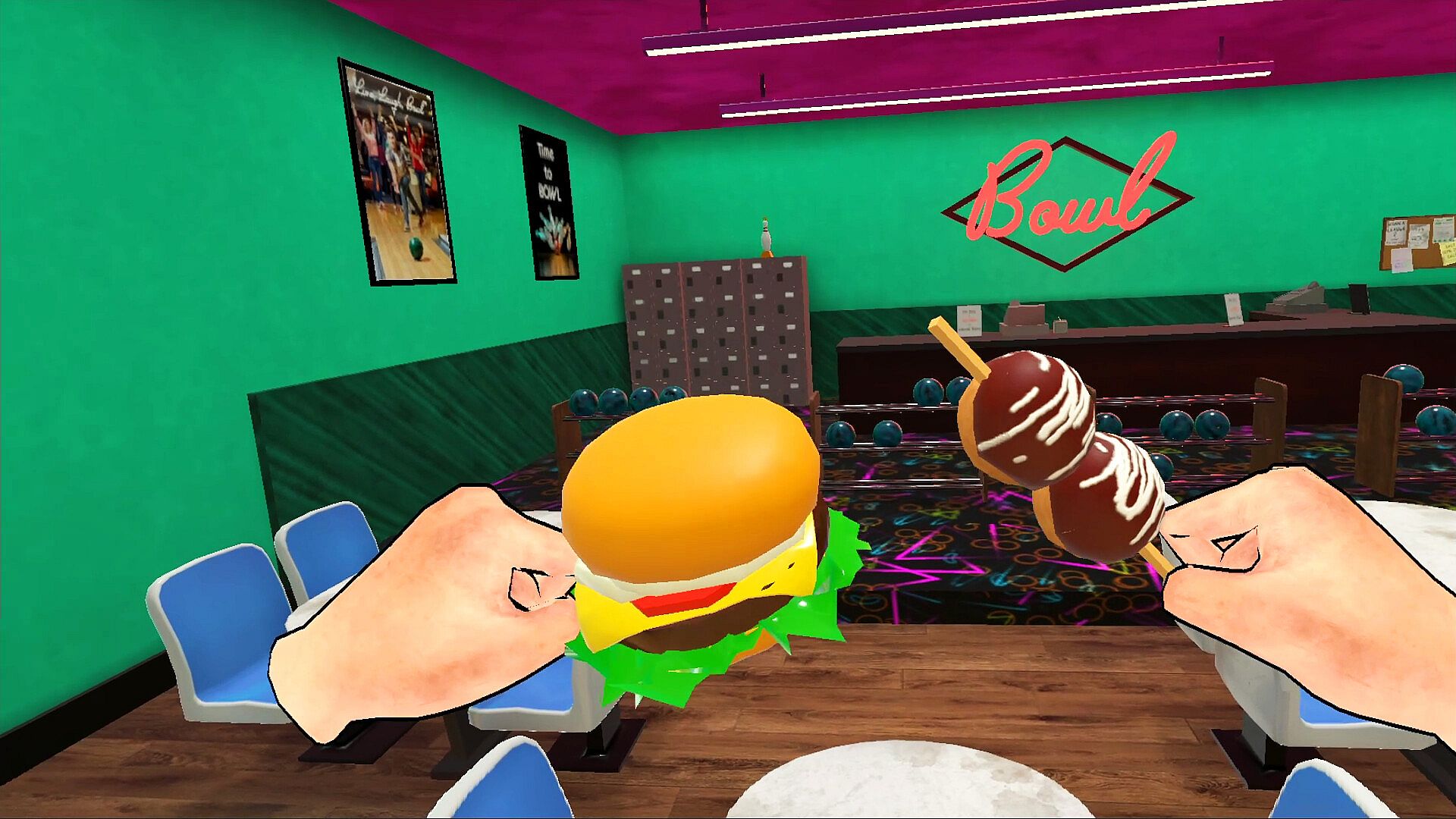 You might be familiar with Pin City already. It’s there, right on the edge of your hometown, a little old bowling alley that looks like it should be out of business, but somehow isn’t. Outside is a cracked and peeling parking lot, watched over by a flickering and buzzing neon sign. When you enter, you’re immediately greeted by the bright neon pattern of the carpet, and the oily aroma of fried food. There are outdated light fixtures above you, draping everything in a slightly yellow light. To your left is a rattling hum from the several aging vending machines. Bowling balls sit side by side in their racks, awaiting the hands of players. To your right on the shoe rental counter is a sign “Closed for private event.” Explore all it has to offer (and maybe find some fun easter eggs in the process!)